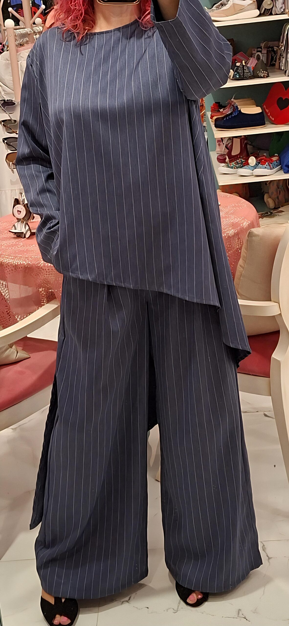 Conjunto compuesto por blusón y pantalón largo en tejido con raya diplomática.
