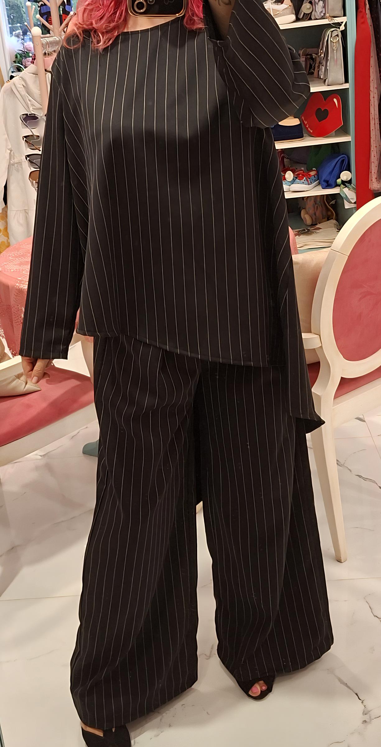 Conjunto compuesto por blusón y pantalón largo en tejido con raya diplomática.