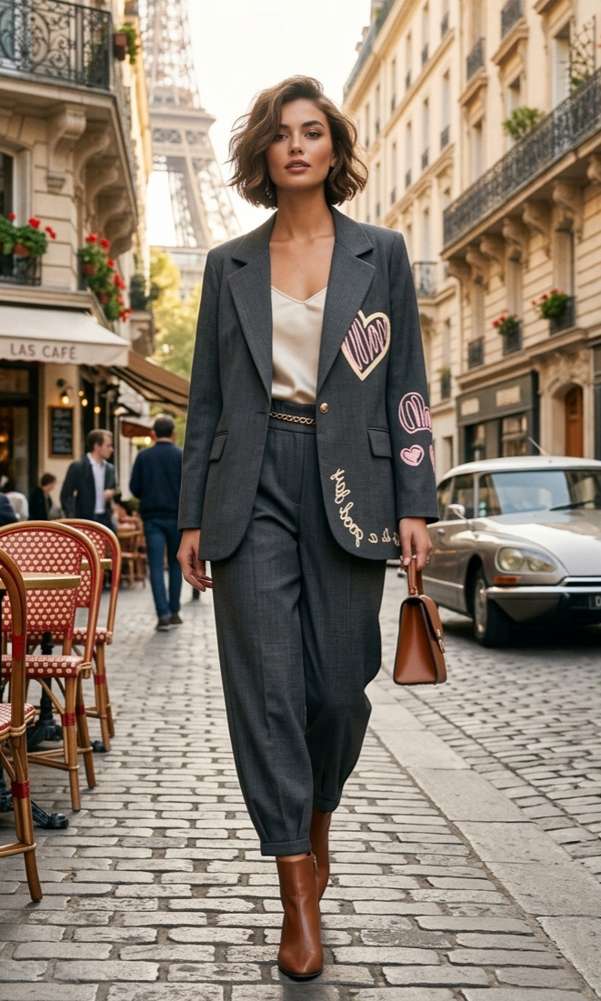 Americana solapas, manga larga, cierre delantero con un botón, forro interior, hombreras y bordados en color rosa y beige.