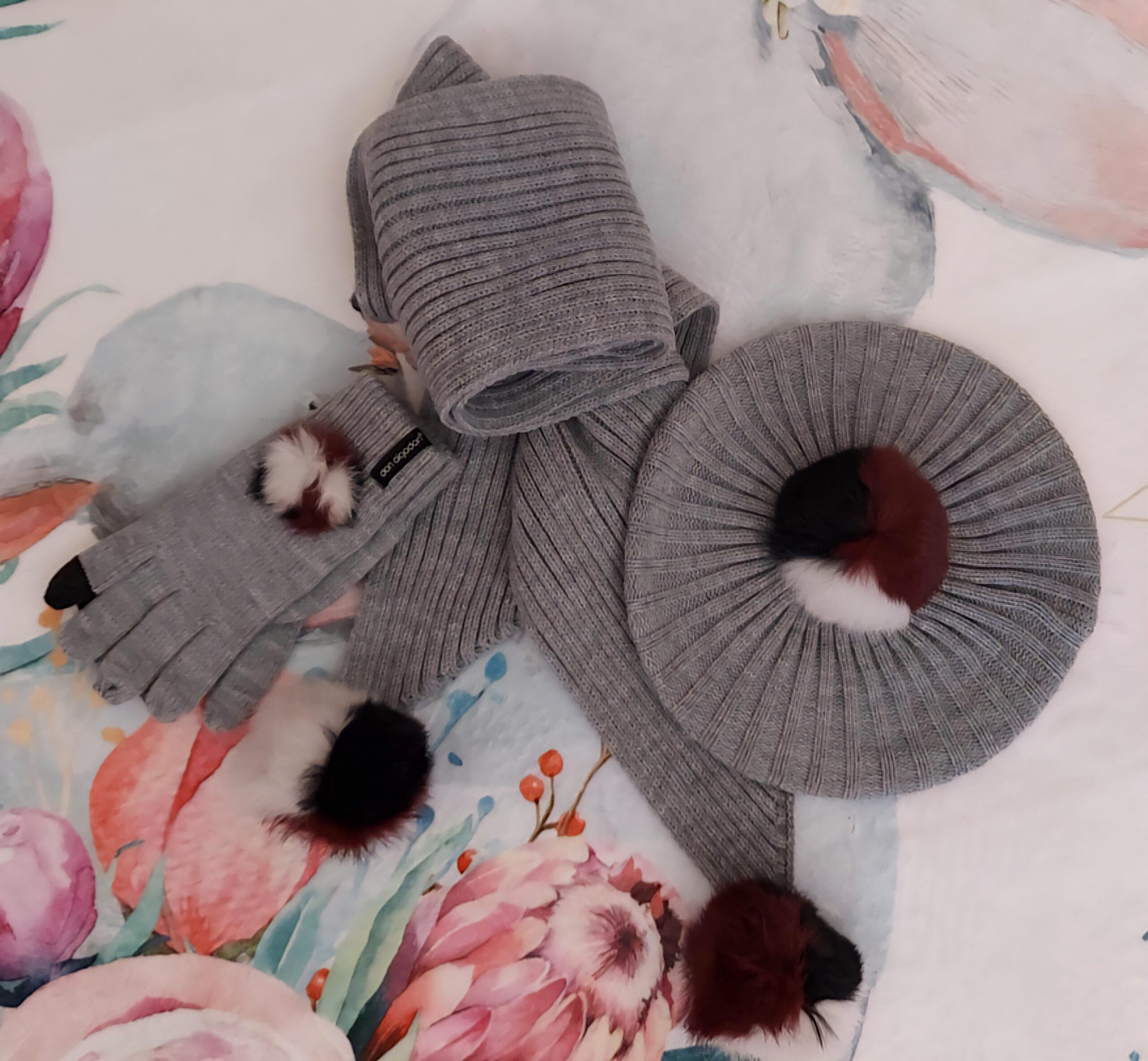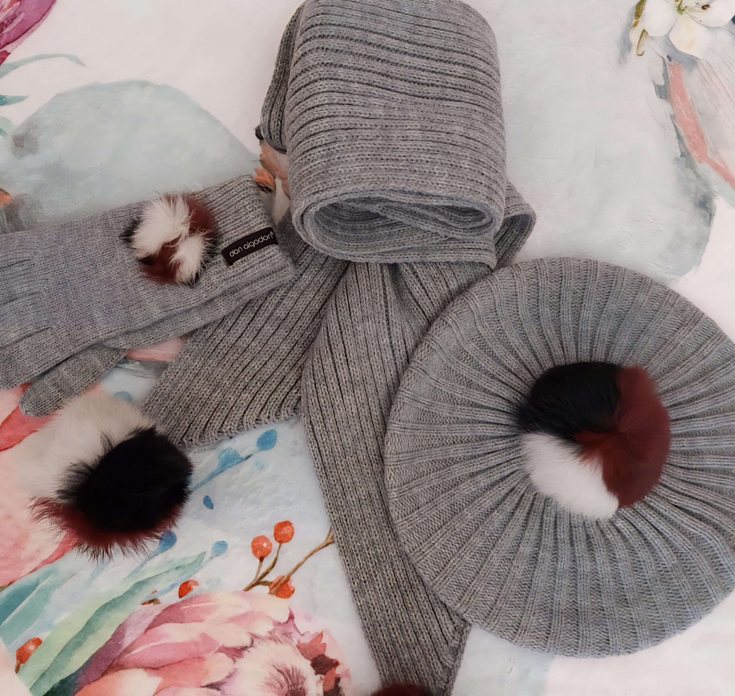 Aplicaciones de bolas de pelo  tricolor suave en puntas de bufanda, boina y guantes.