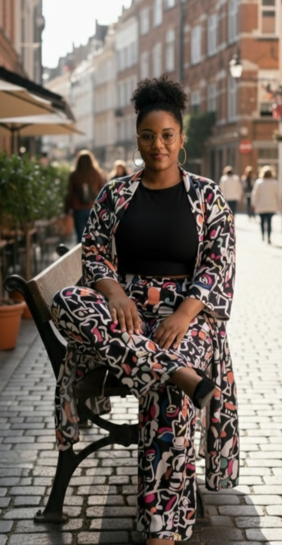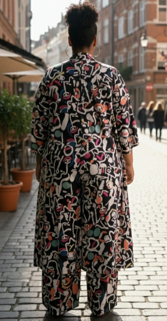Conjunto de kimono y pantalón estampado.