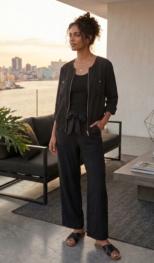 Conjunto en tejido fluido compuesto por pantalón y chaqueta.
