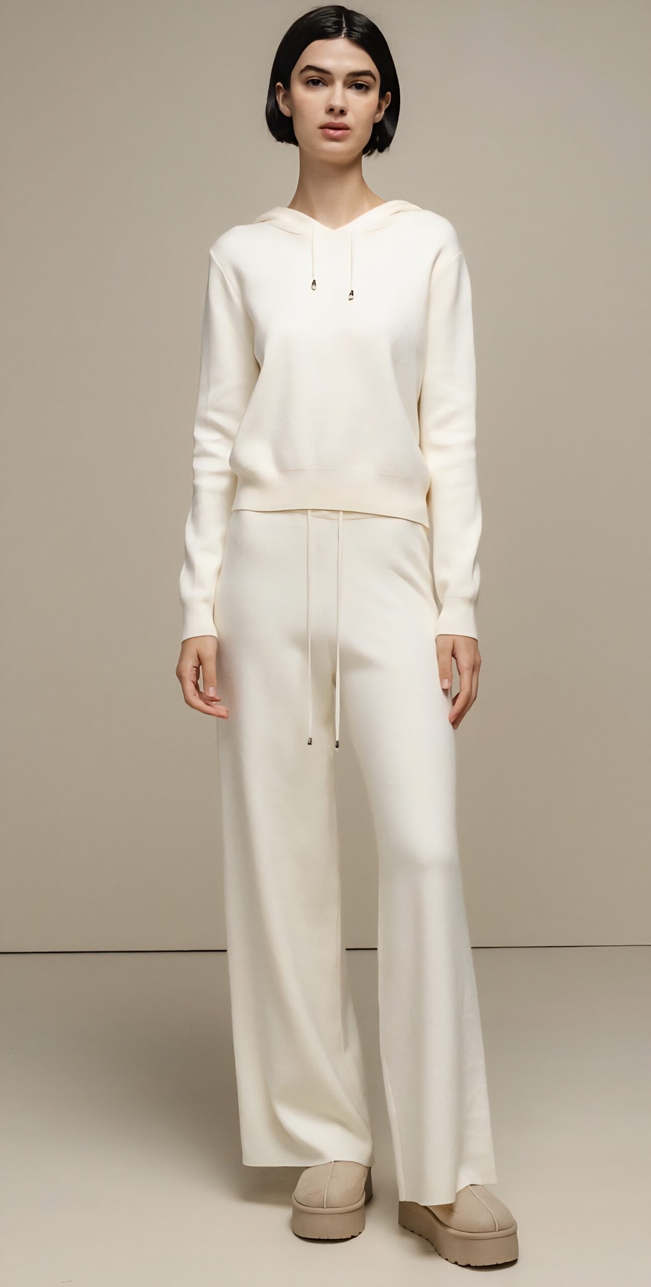 Compuesto por jersey patrón sudadera con capucha y pantalón largo de pata ancha.