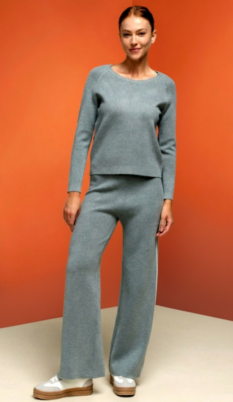 Conjunto de punto de dos piezas; Pantalón y jersey color verde.