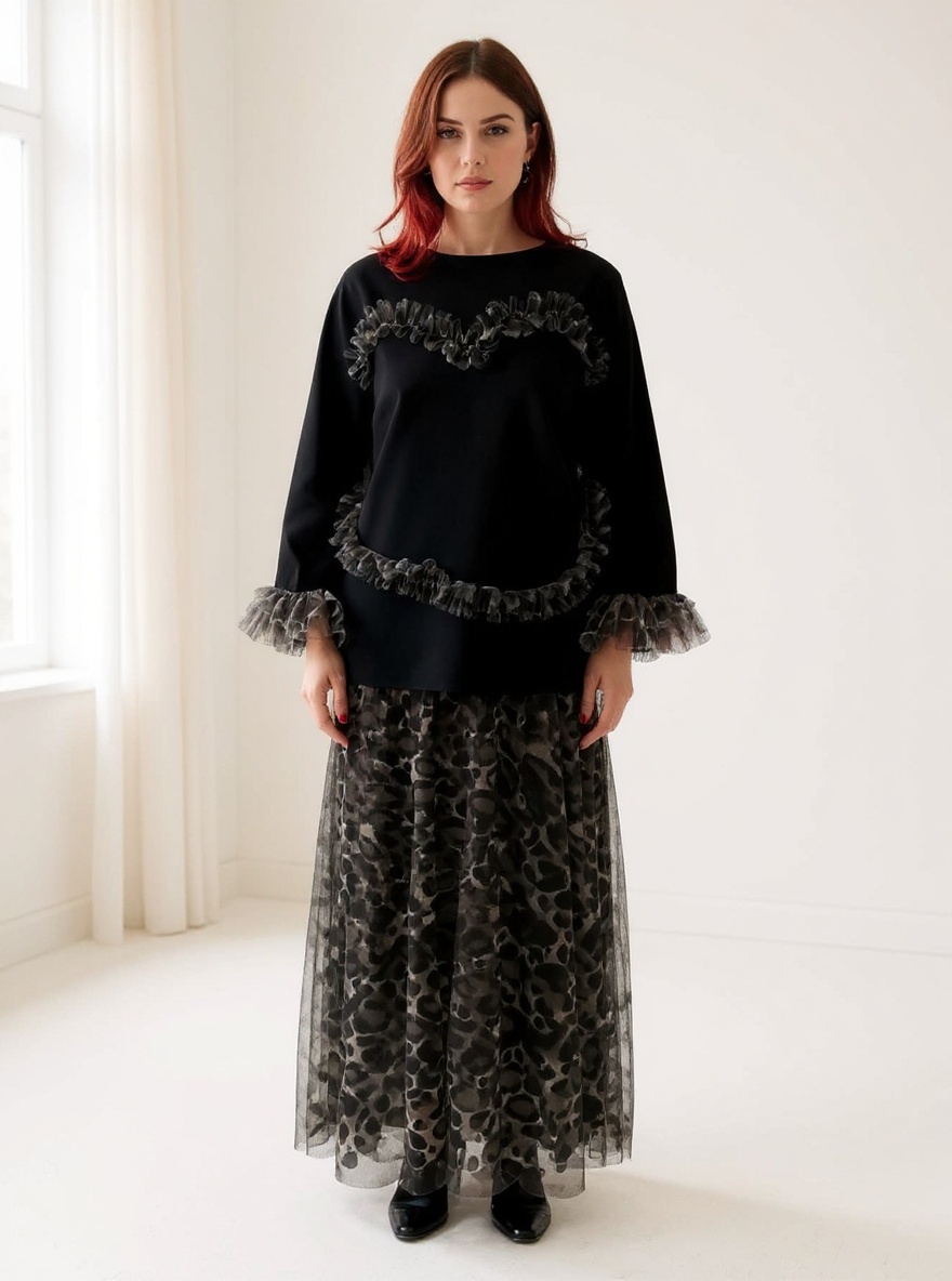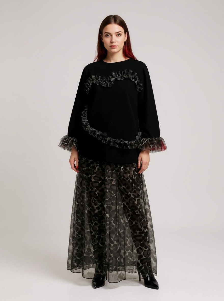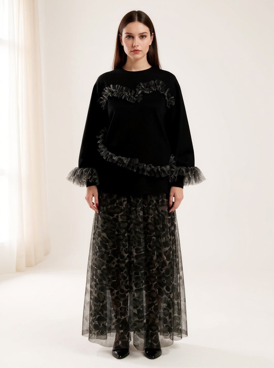 Sudadera overside con cuello redondo, manga larga, detalle de medio corazón de tul animal print en delantera y volantes en mangas.