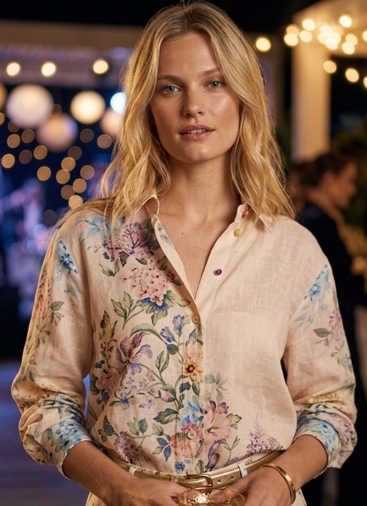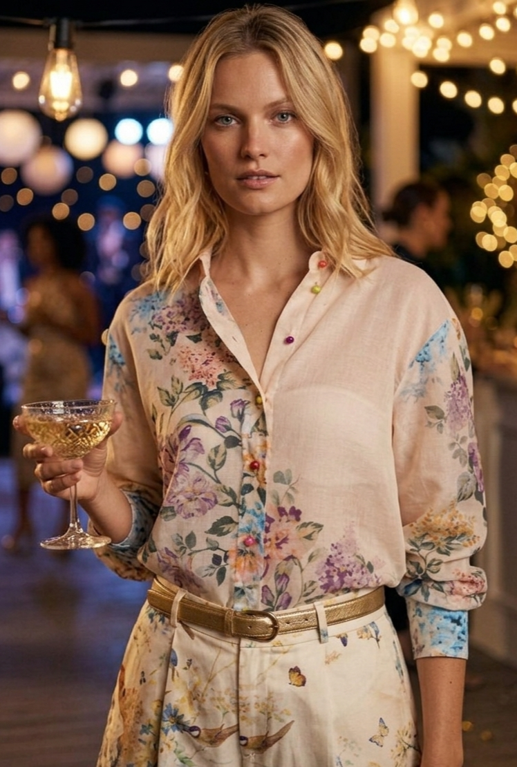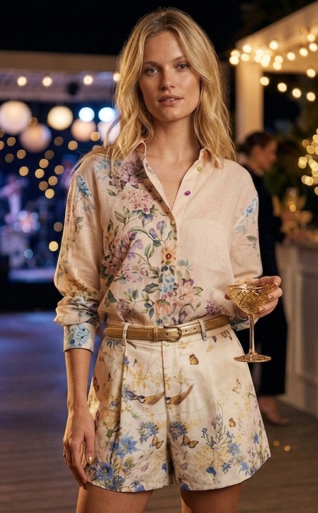 Pantalón mini con estampación floral romántico multicolor sobre fondo beige.