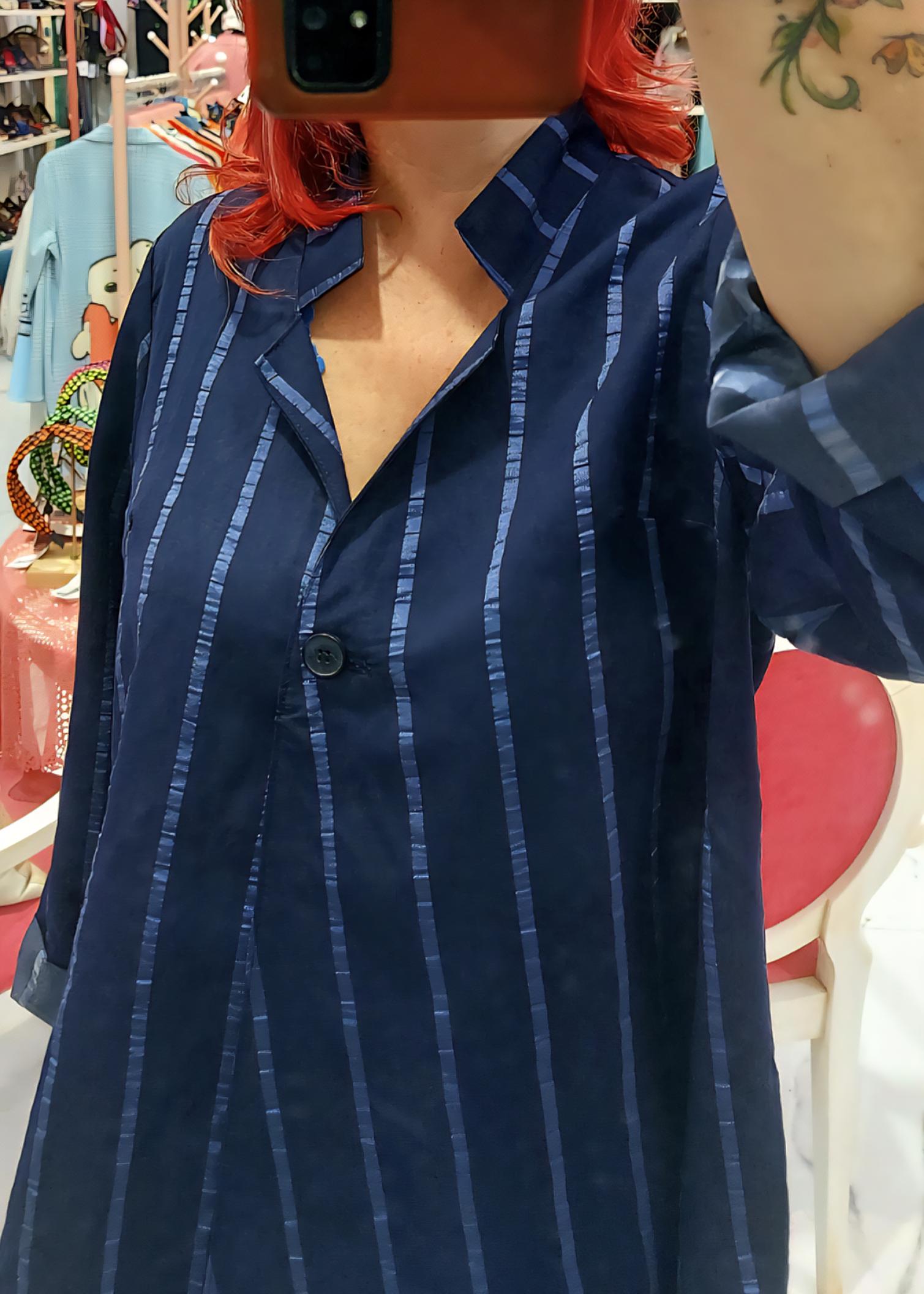 Chaqueta overside con corte en A, manga larga, rajetas laterales y cierre con un botón.