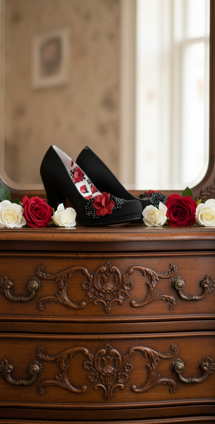 Detalle de flores decorativas en el lateral en rojo y negro.