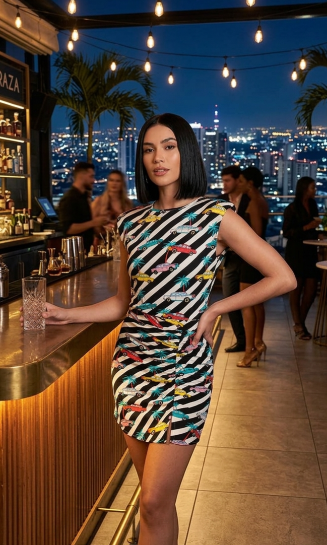 Estampación de coches multicolor sobre fondo blanco y negro.