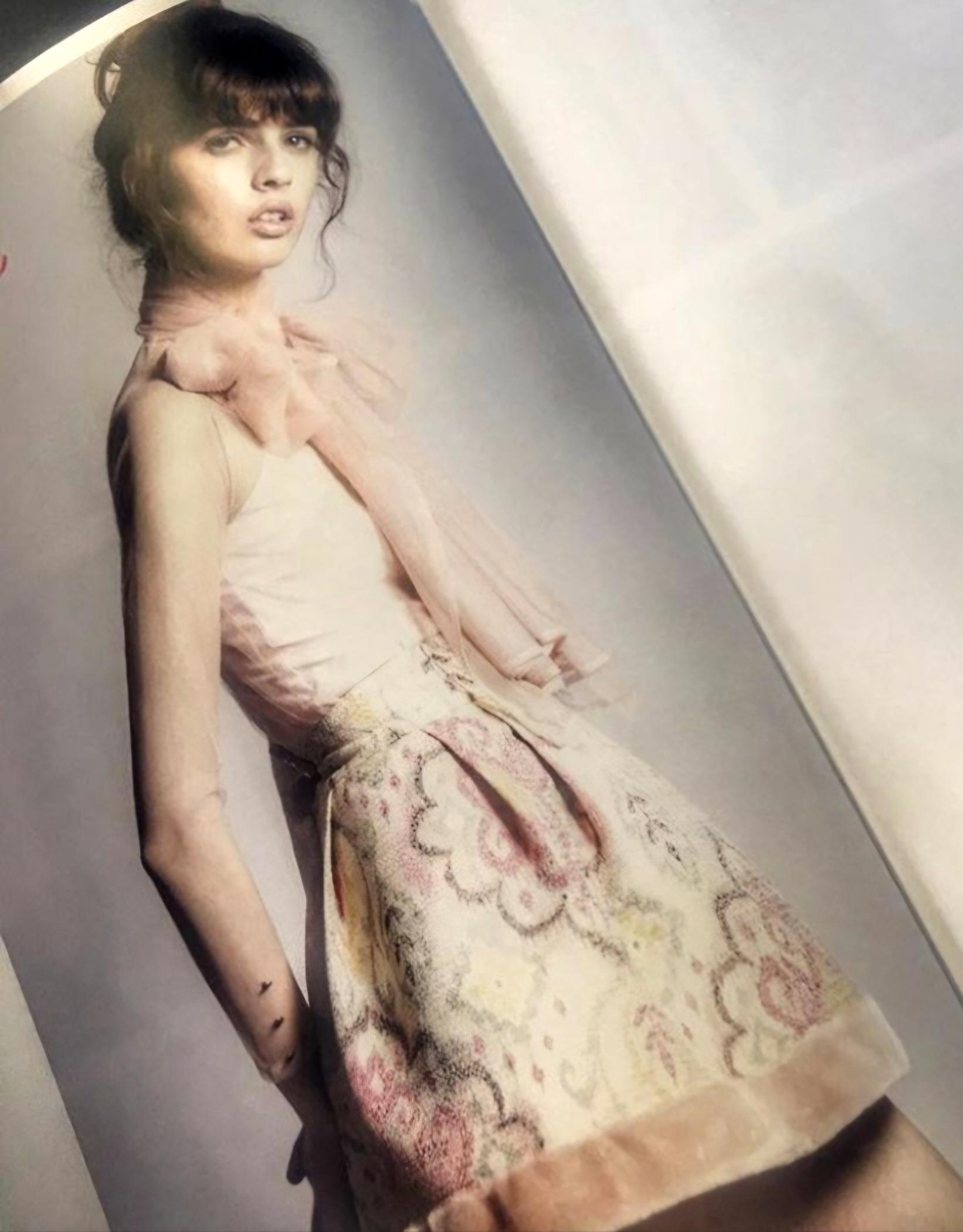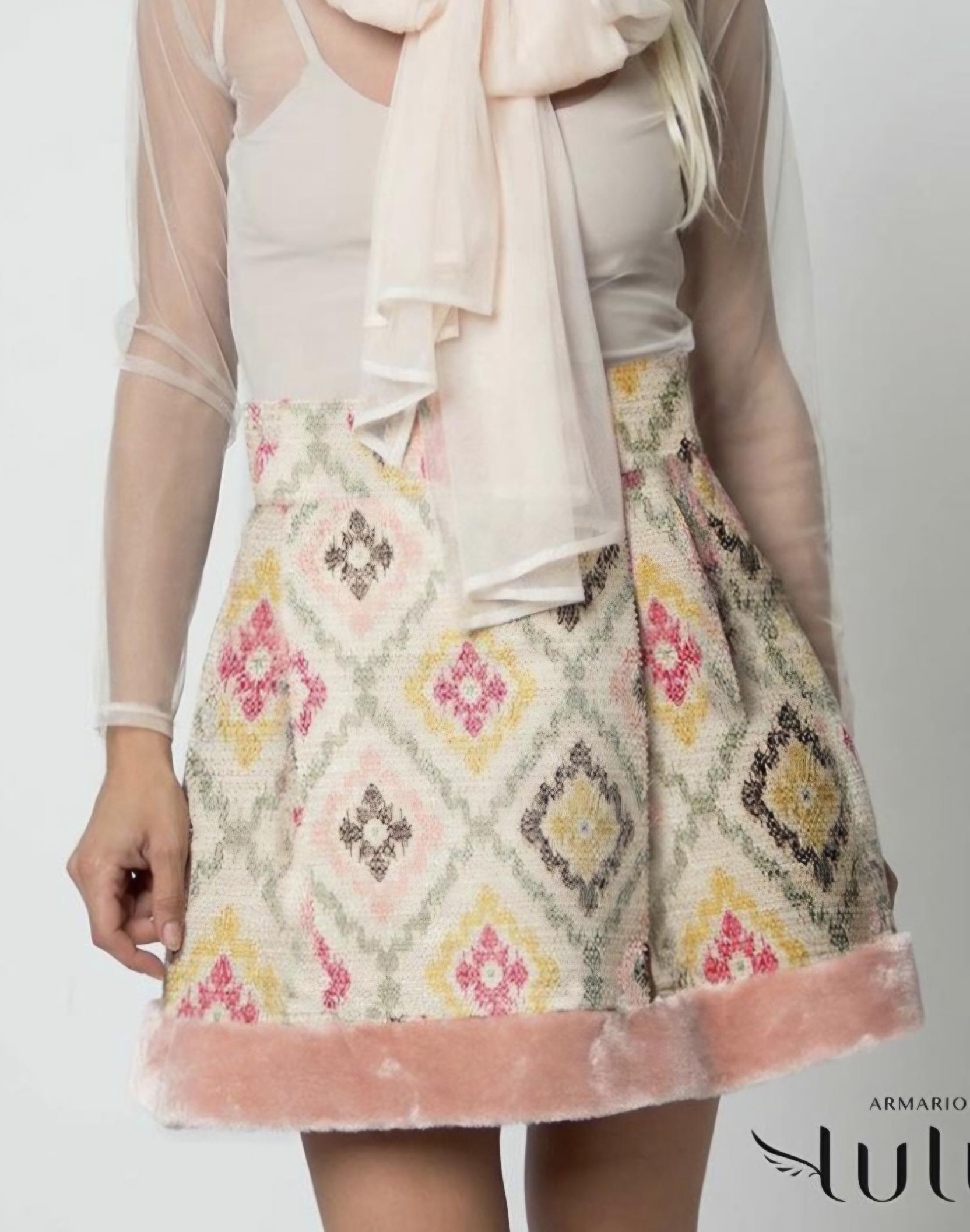 Falda en tejido de punto grueso decorada con pelo rosa en el bajo.