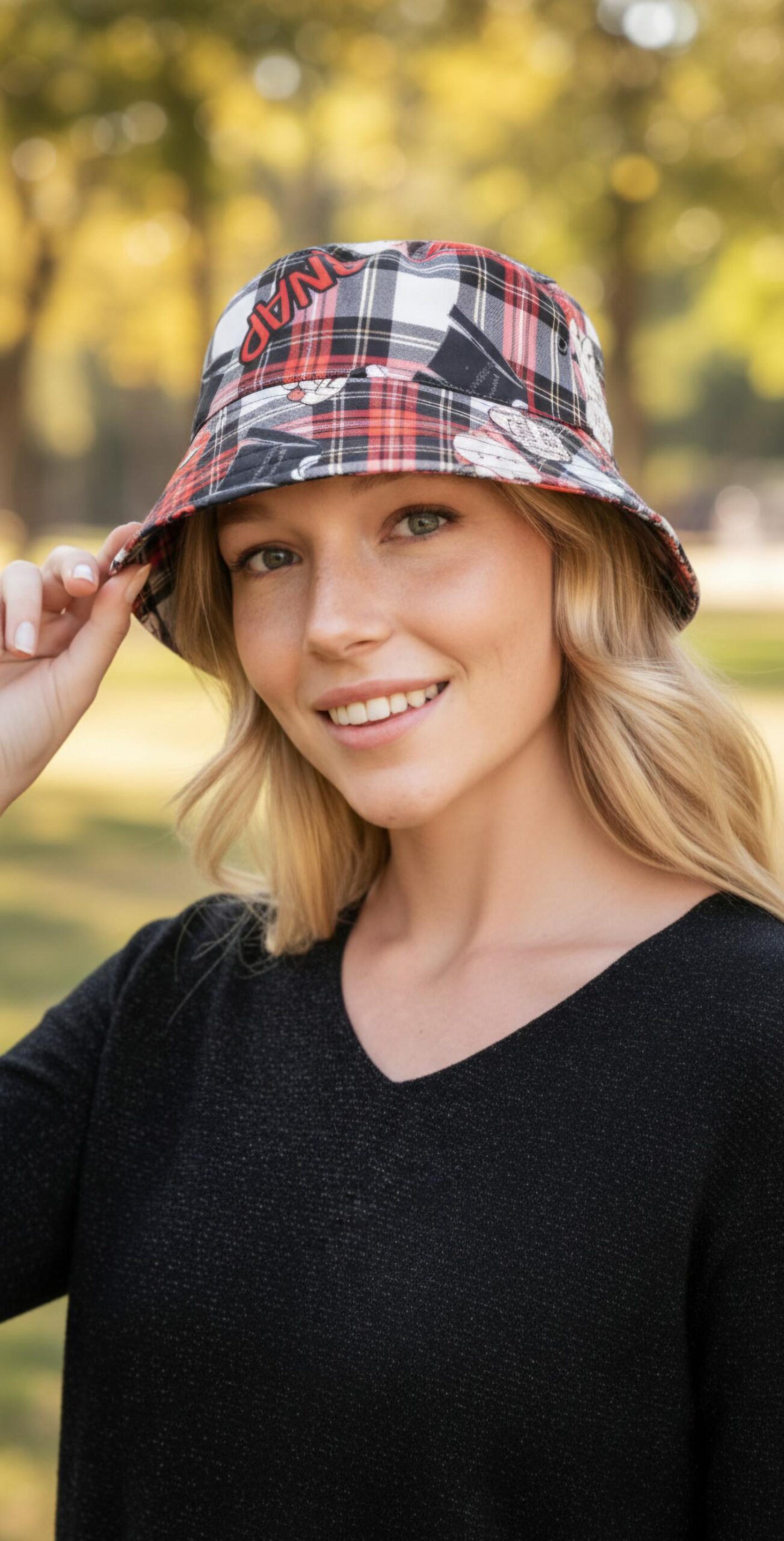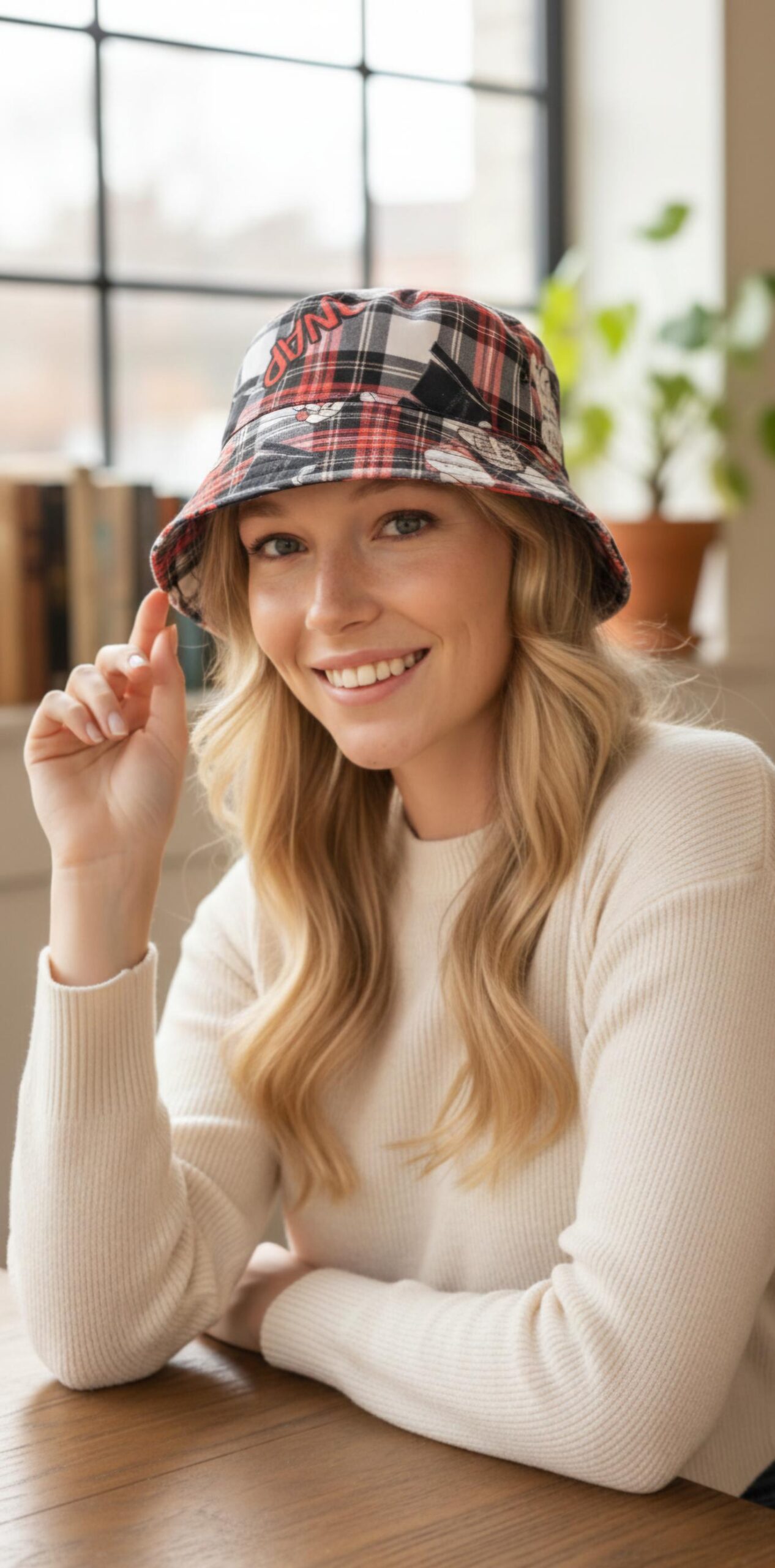 Gorro con estampado a cuadros en rojo, negro y blanco.