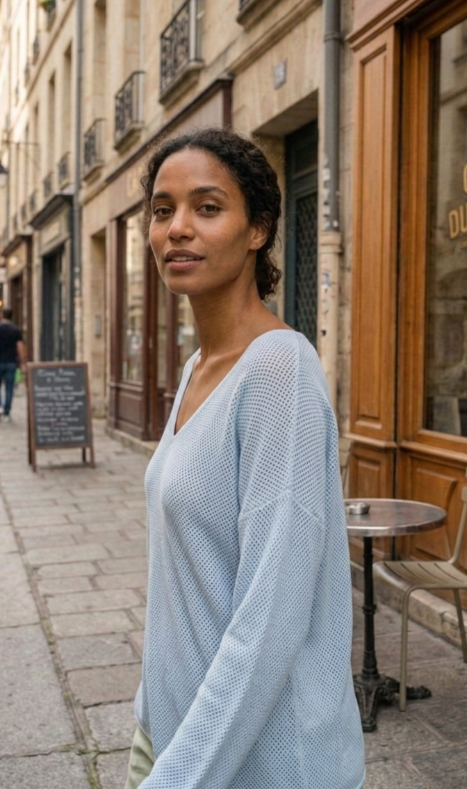 Jersey de hilo en punto de rejilla color celeste.