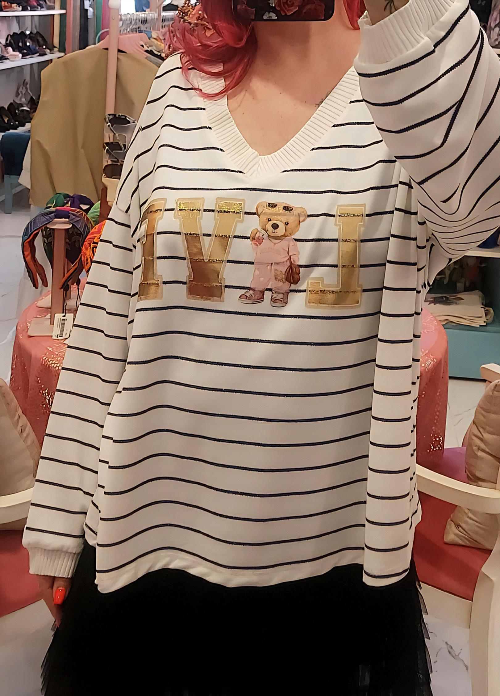 Escote en V y manga larga.