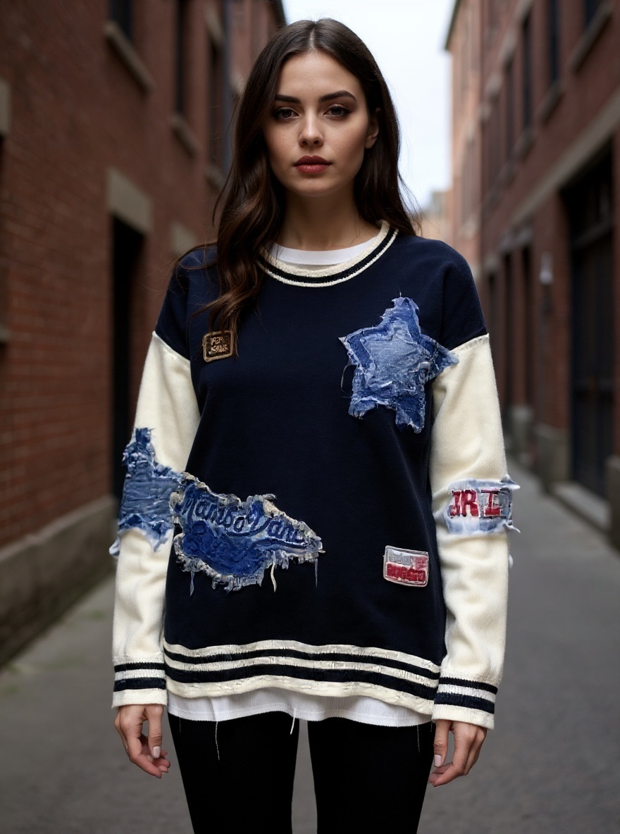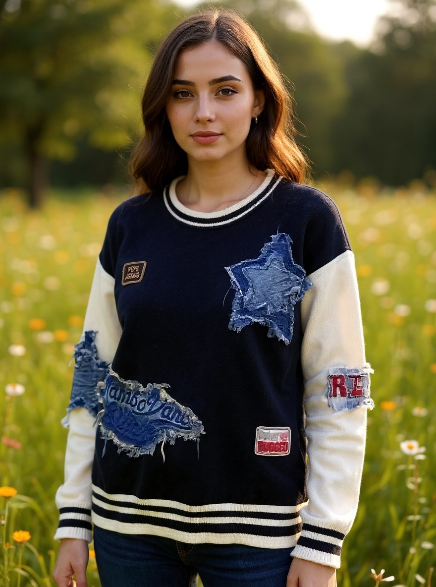 Detalle de parches desflecados vaqueros bordados en delantera y mangas.