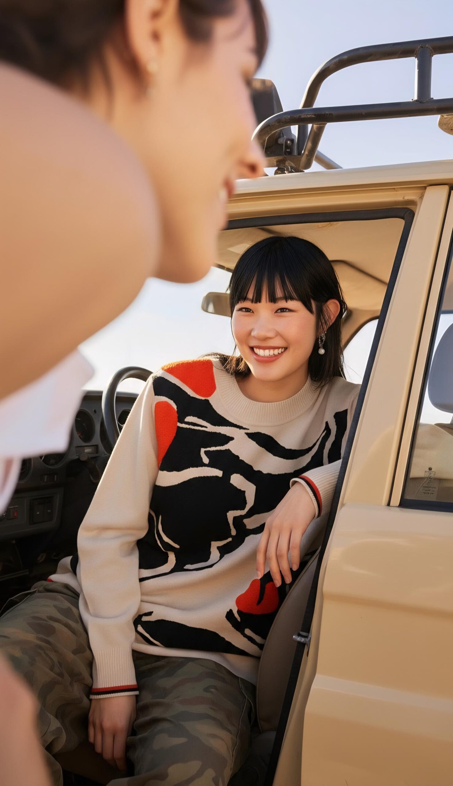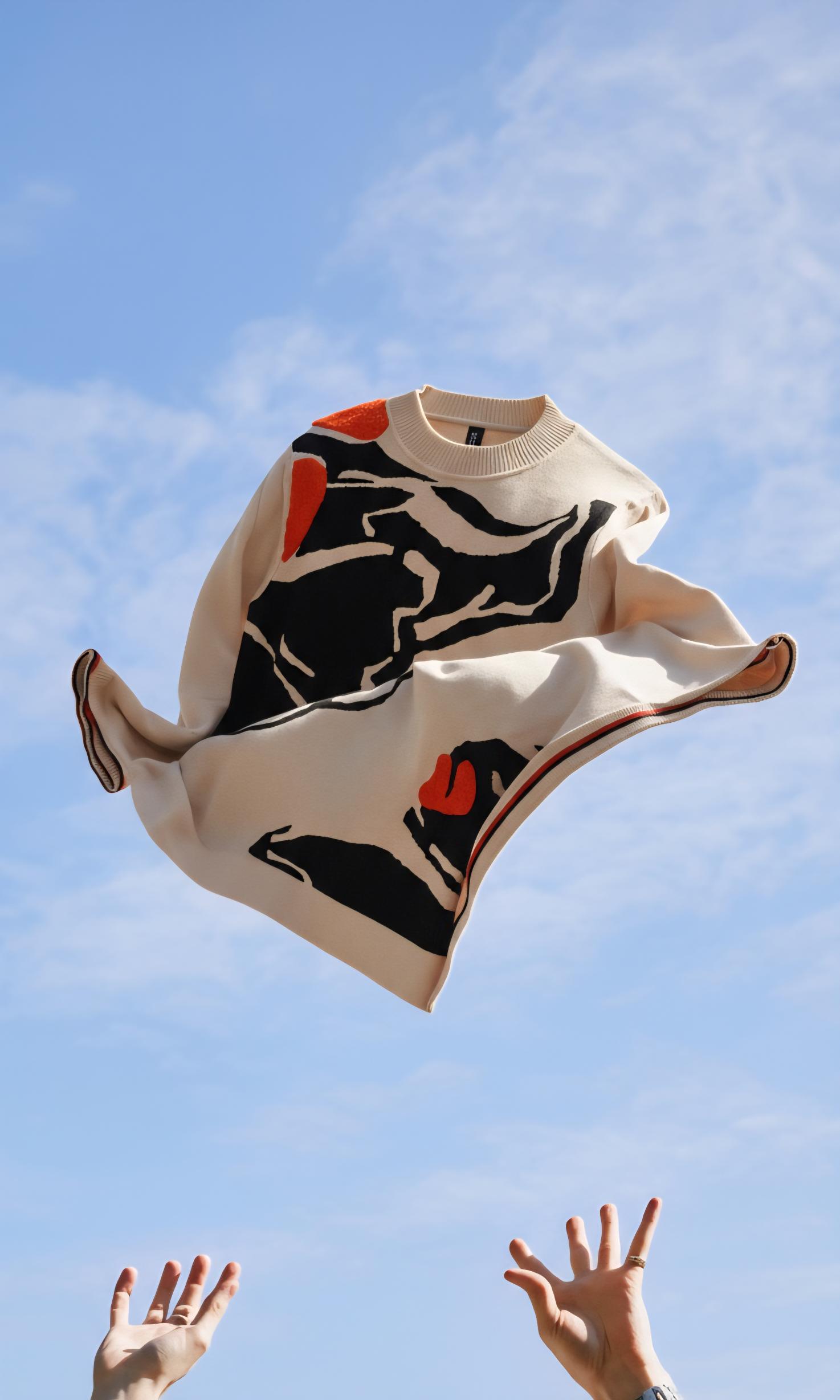 Estampación delantera en color negro y naranja sobre fondo beige.