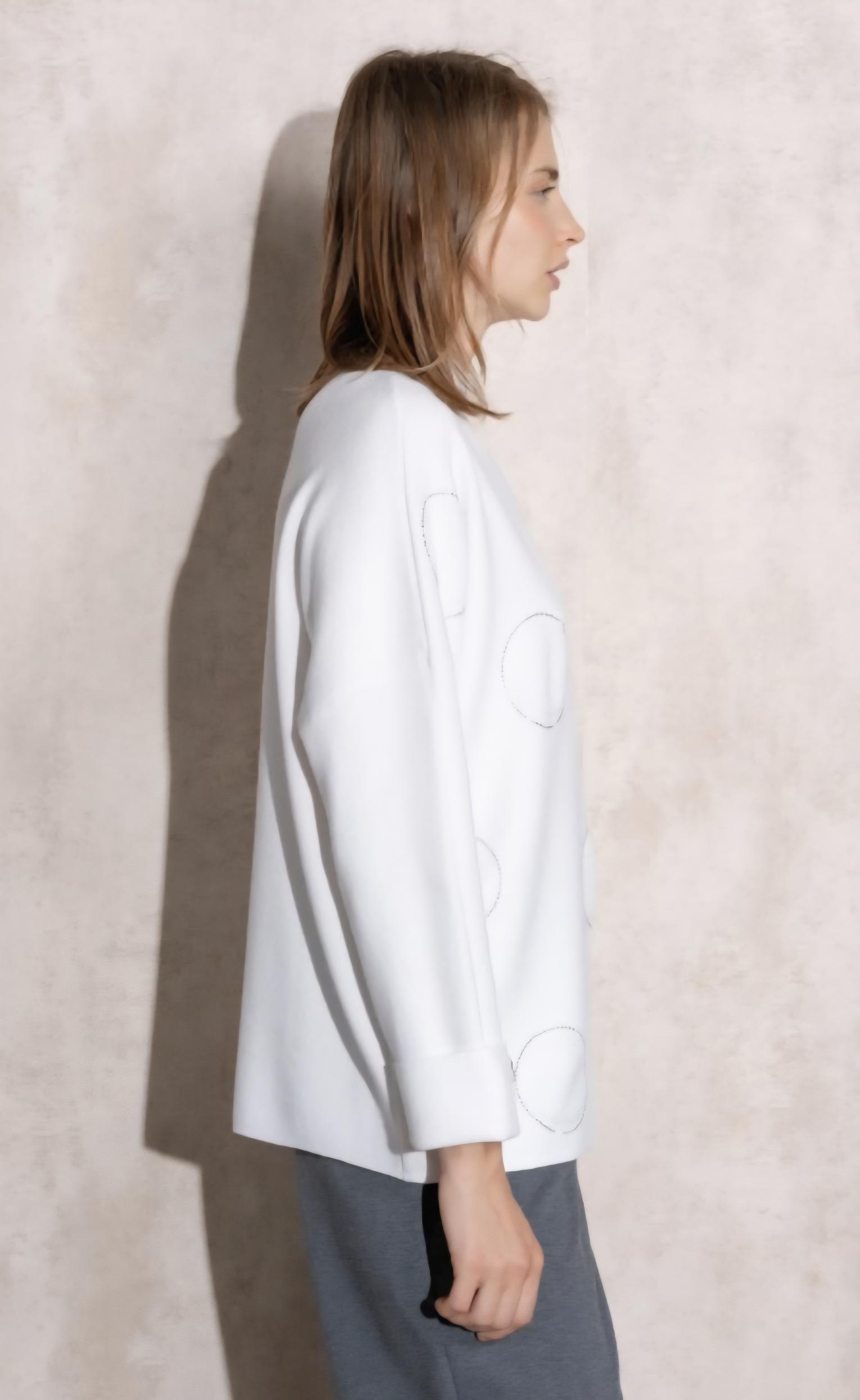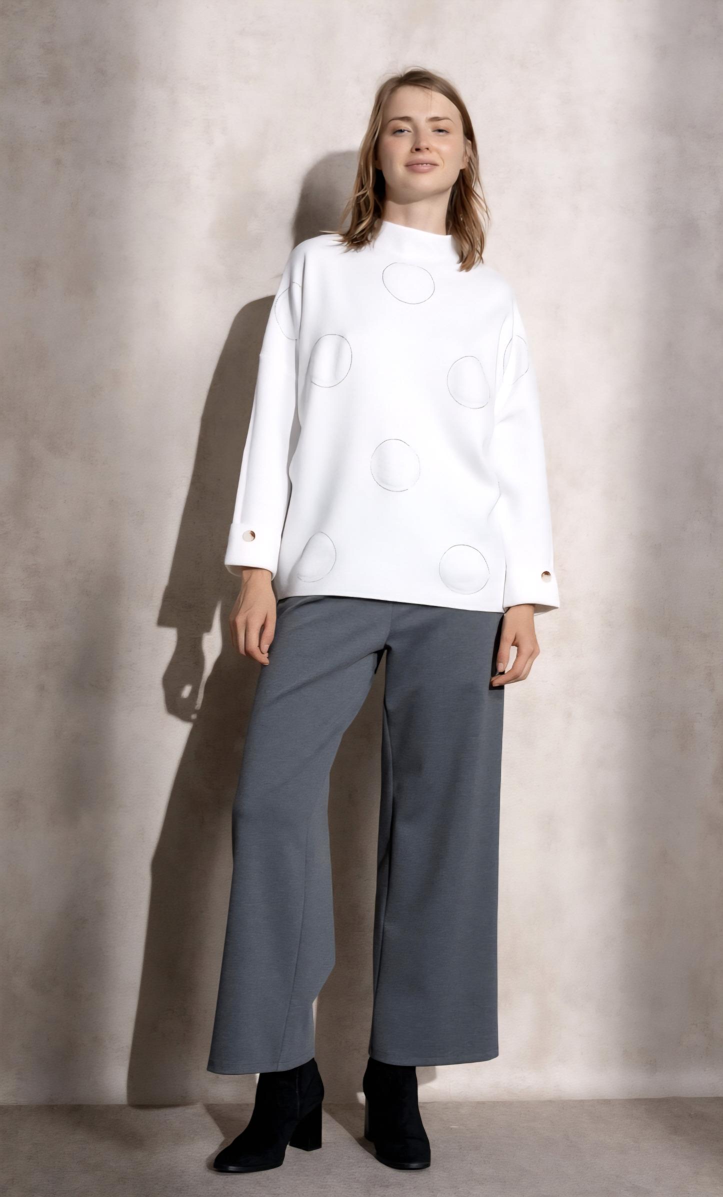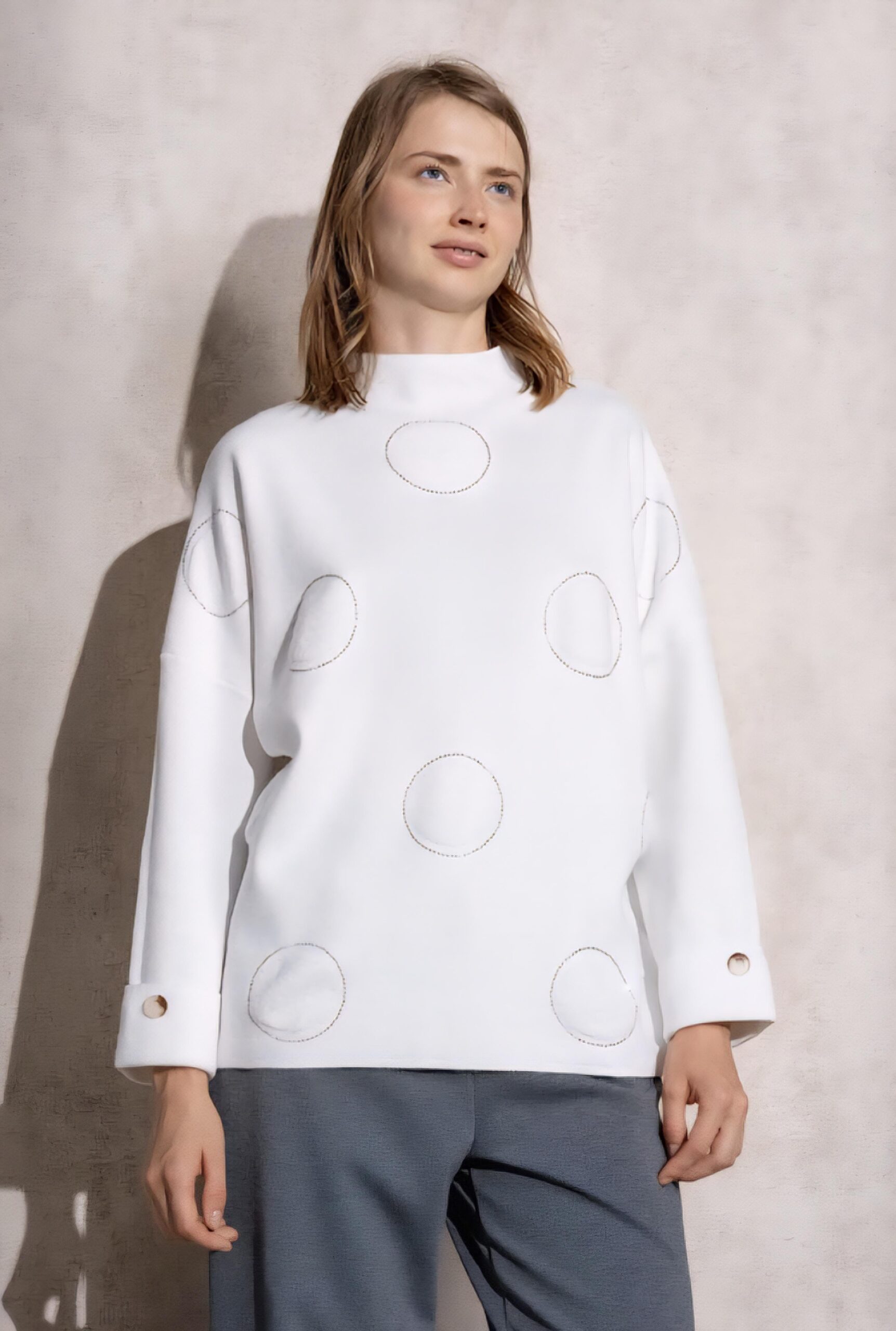 Cuello chimenea y manga larga con vuelta y botón decorativo.