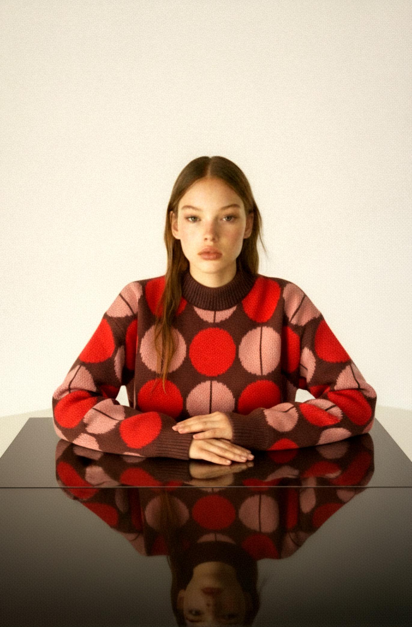 Estampación de maxi lunares en tonos coral y rosado sobre fondo marrón chocolate.