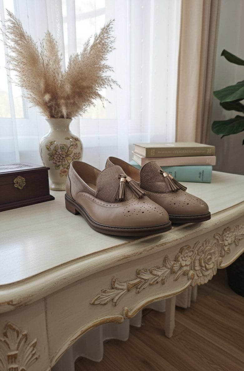 Mocasín plano estilo Oxford color beige.