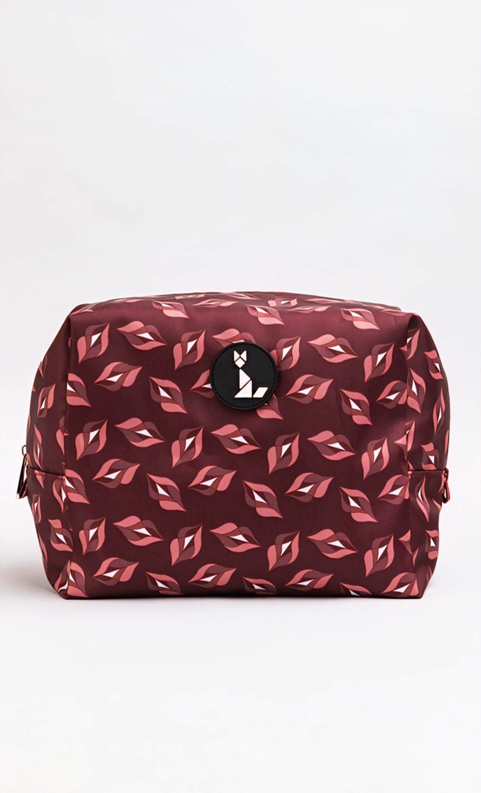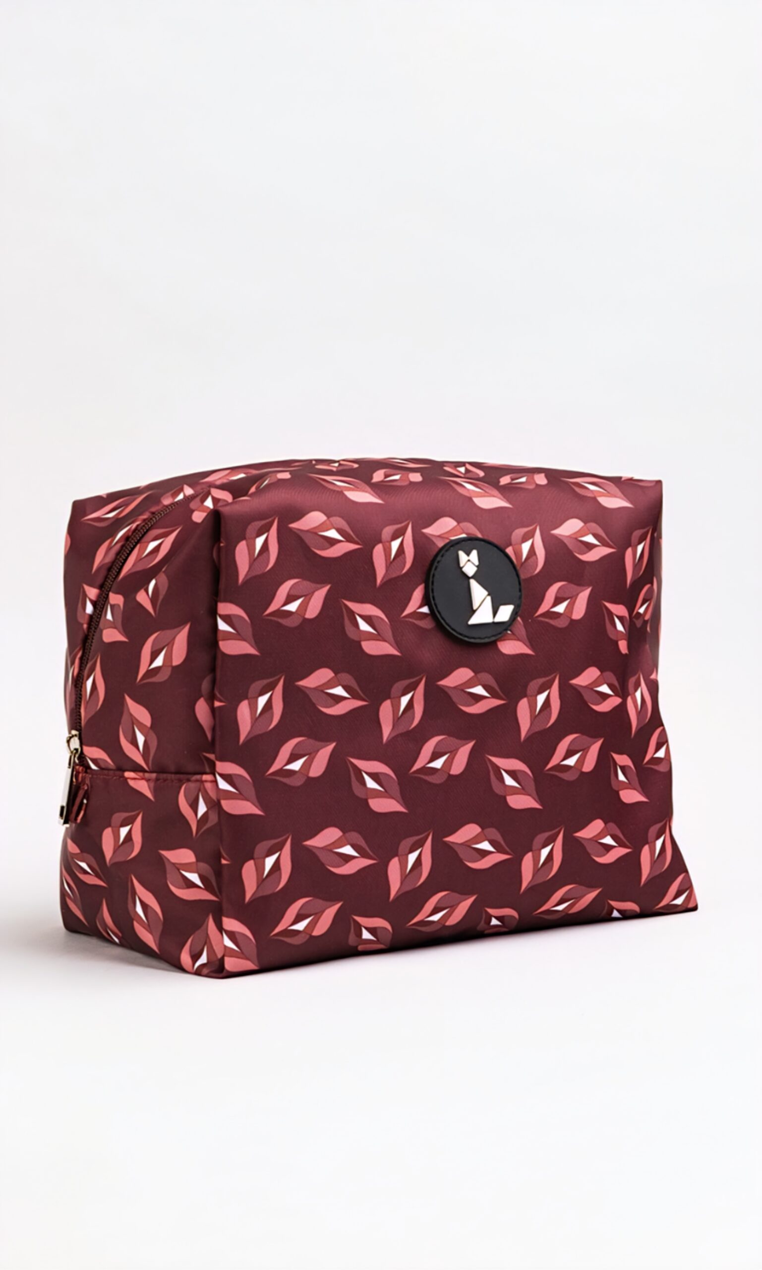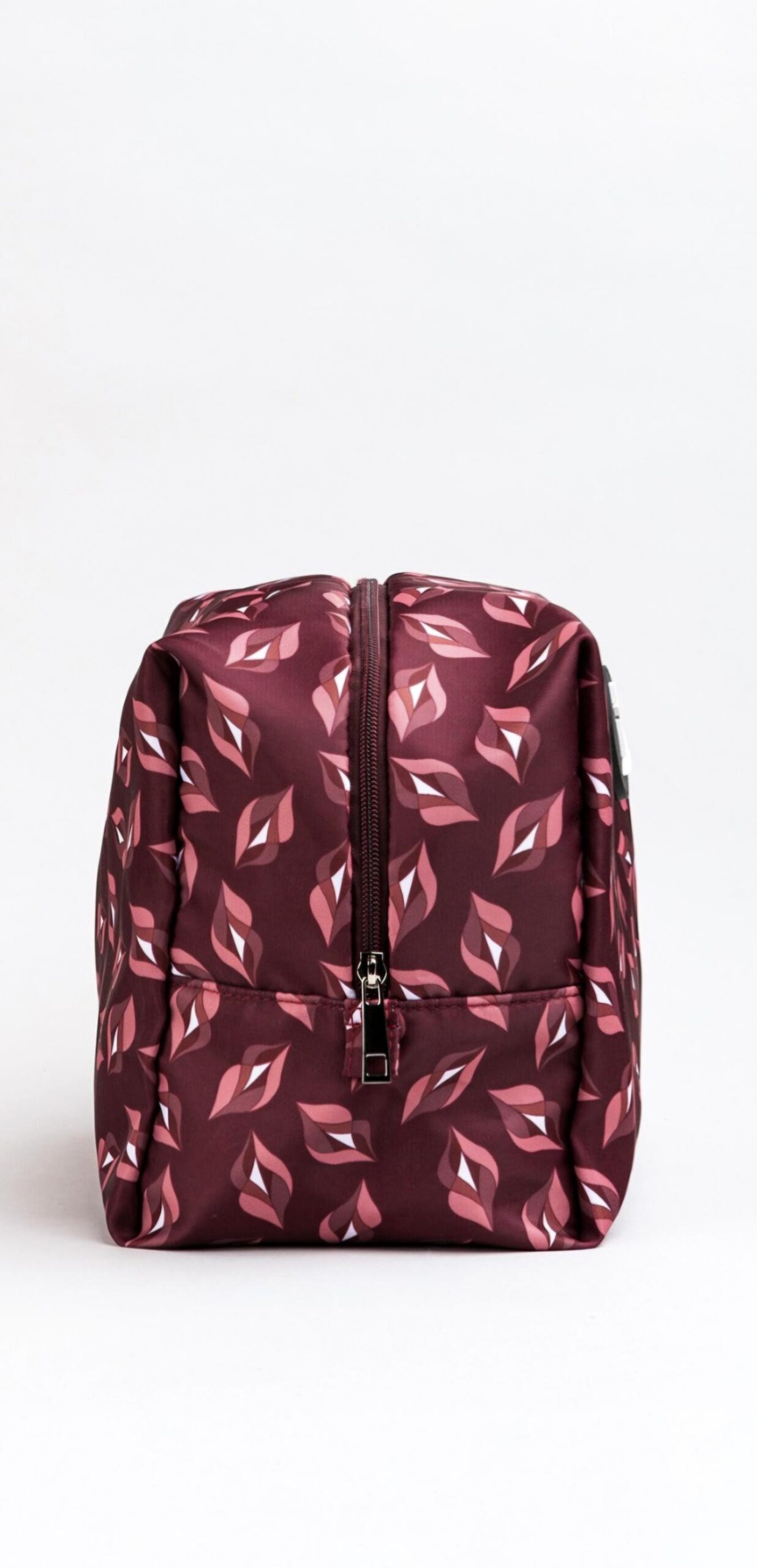 Neceser de viaje en tejido impermeable con estampación de labios sobre fondo burdeos.