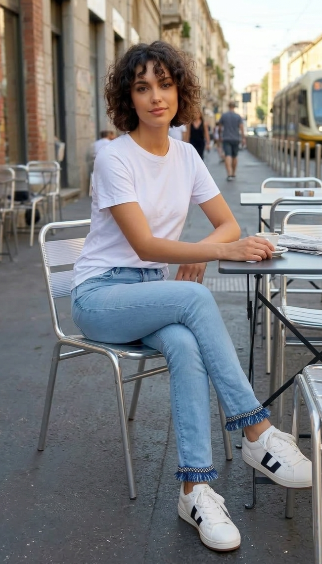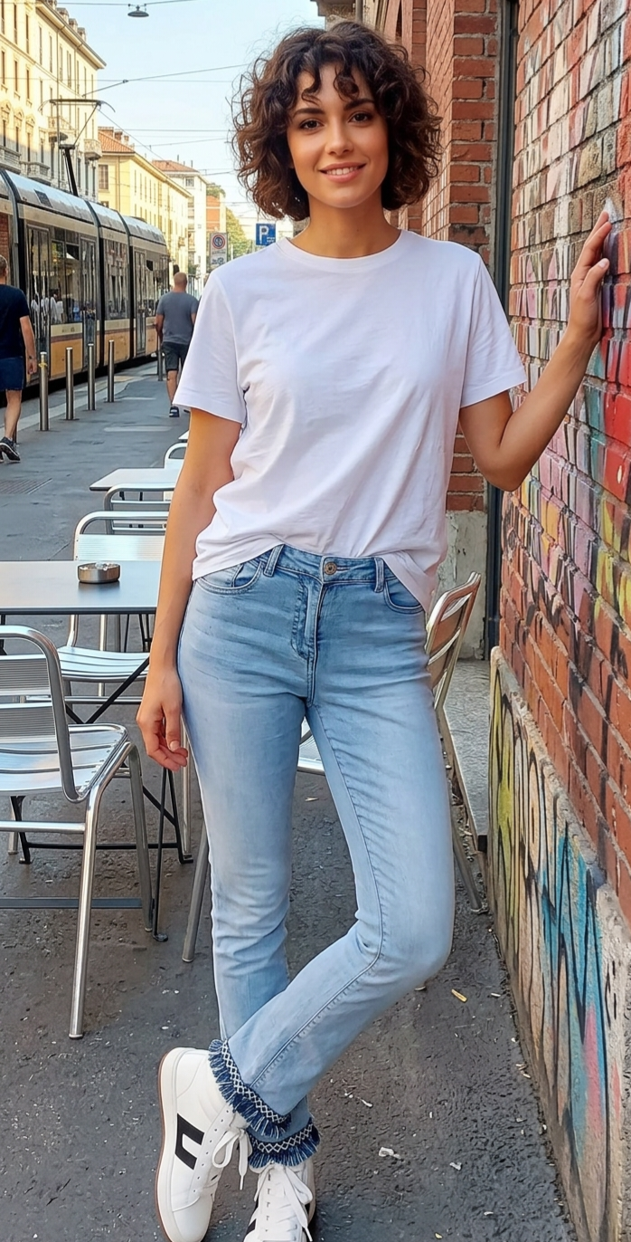 Pantalón vaquero de tiro alto, pitillo y elástico.