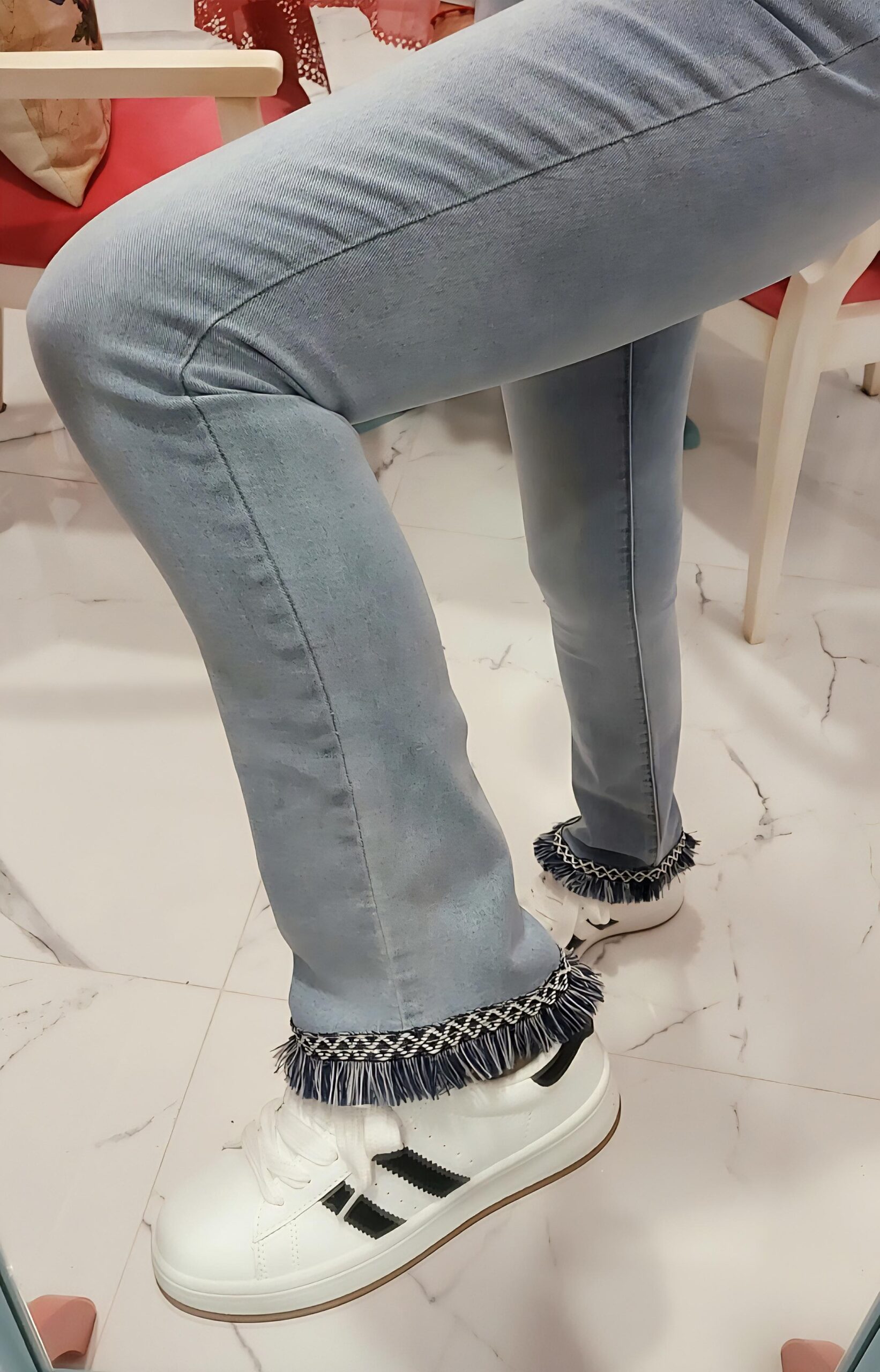 Detalle de pasamanería desflecada en el bajo.