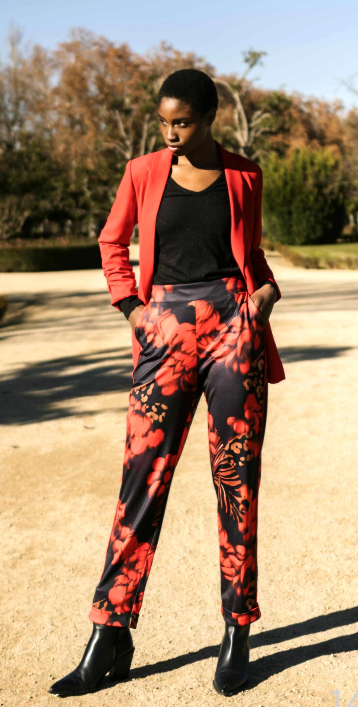 Estampación floral color rojo sobre fondo negro.