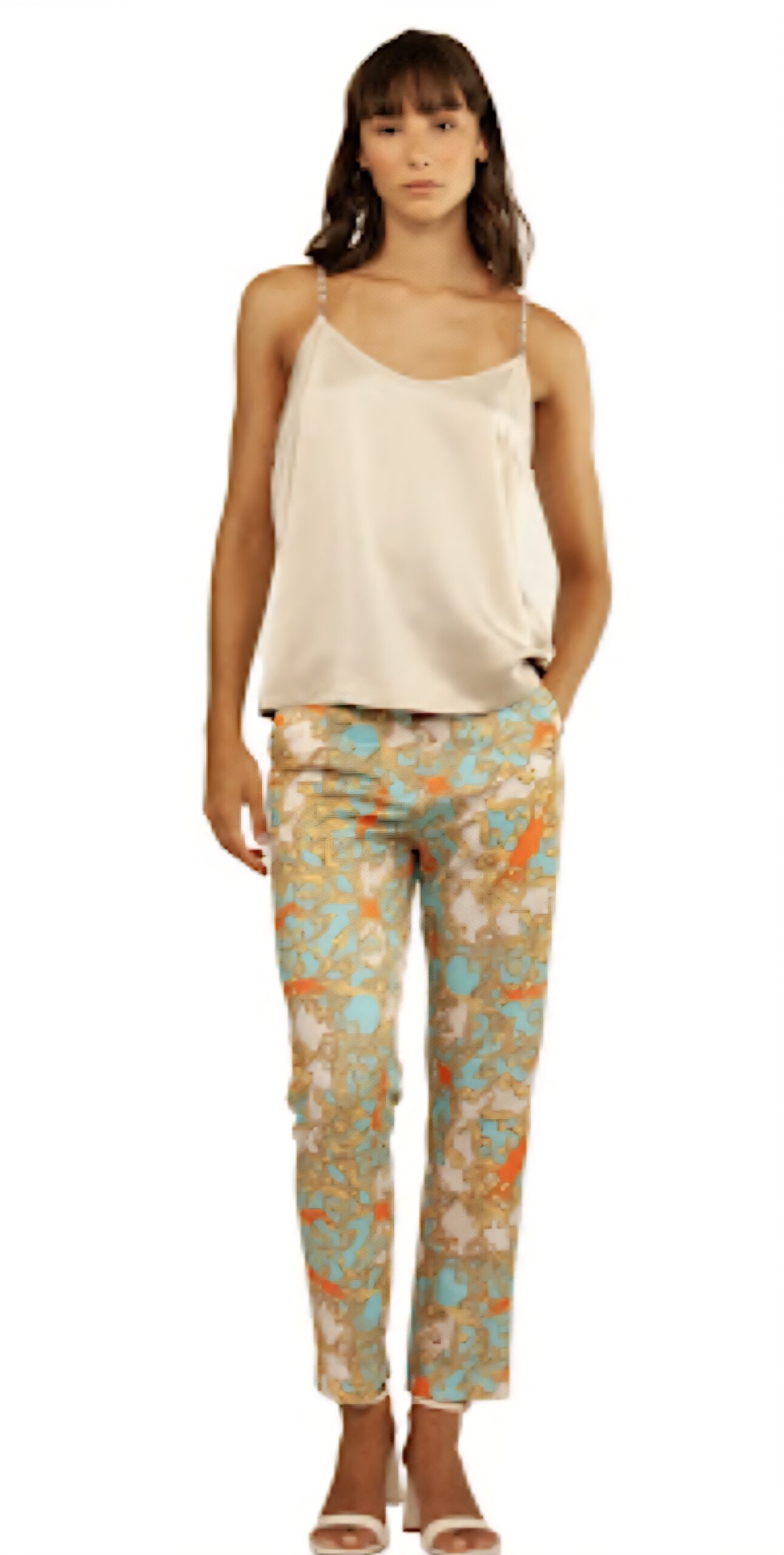 Estampación barroca sobre fondo beige, naranja y turquesa.
