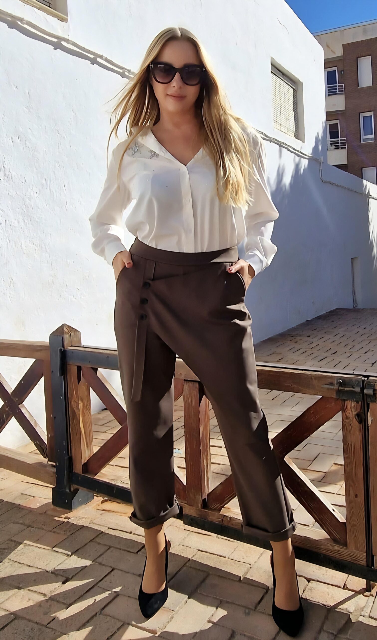 Pantalón largo en punto Milano, cintura engomada y bolsillos laterales.