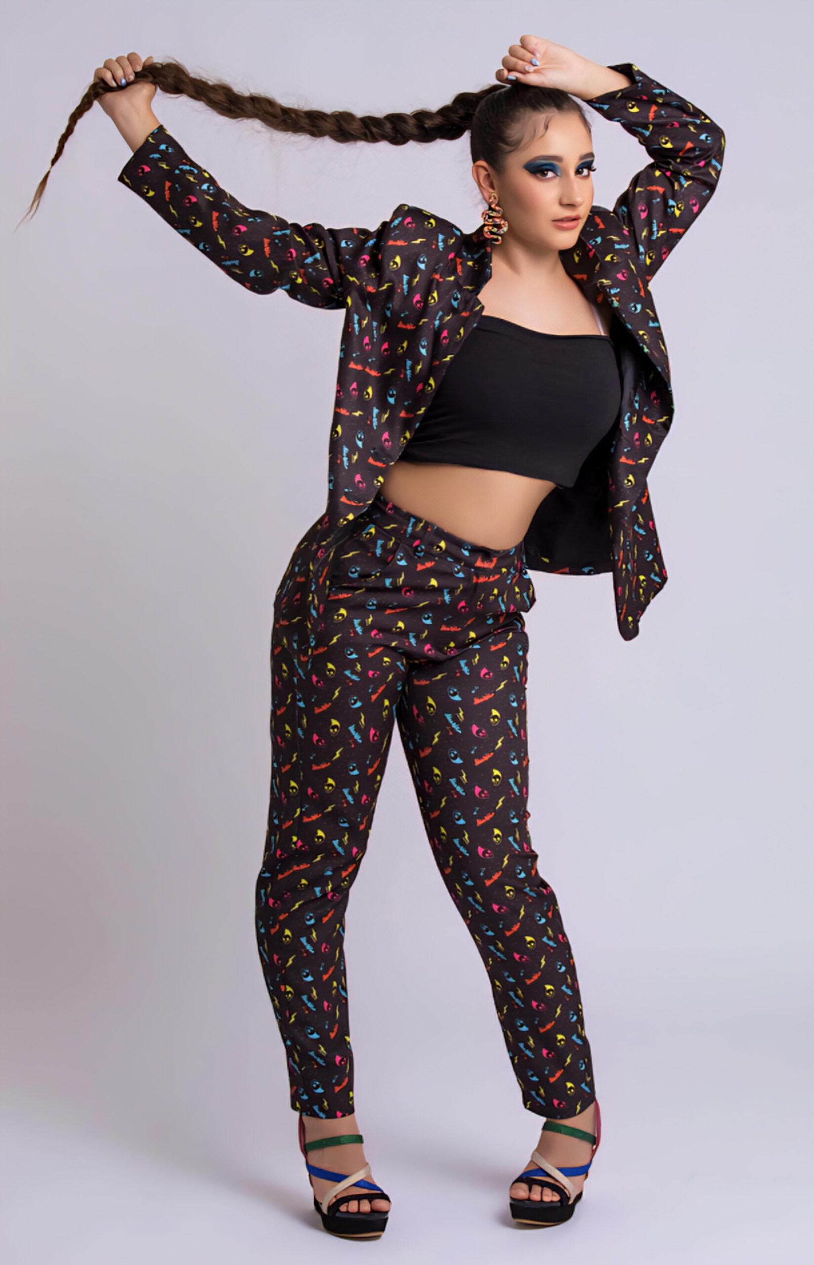Estampación de mini calaveras multicolor sobre fondo negro.