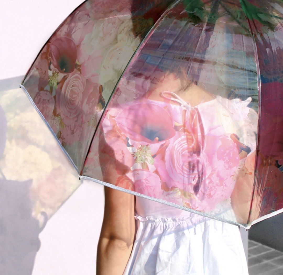 Paraguas transparente con estampación floral.