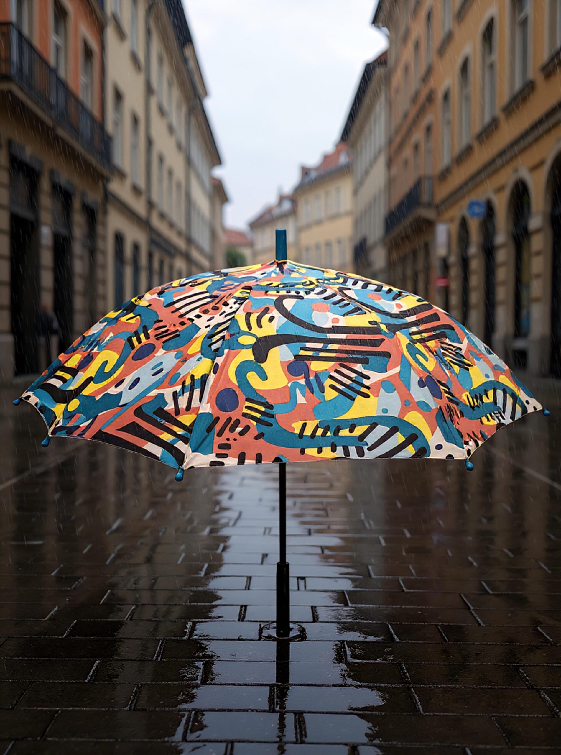 Paraguas de bastón con estampación geométrica multicolor.