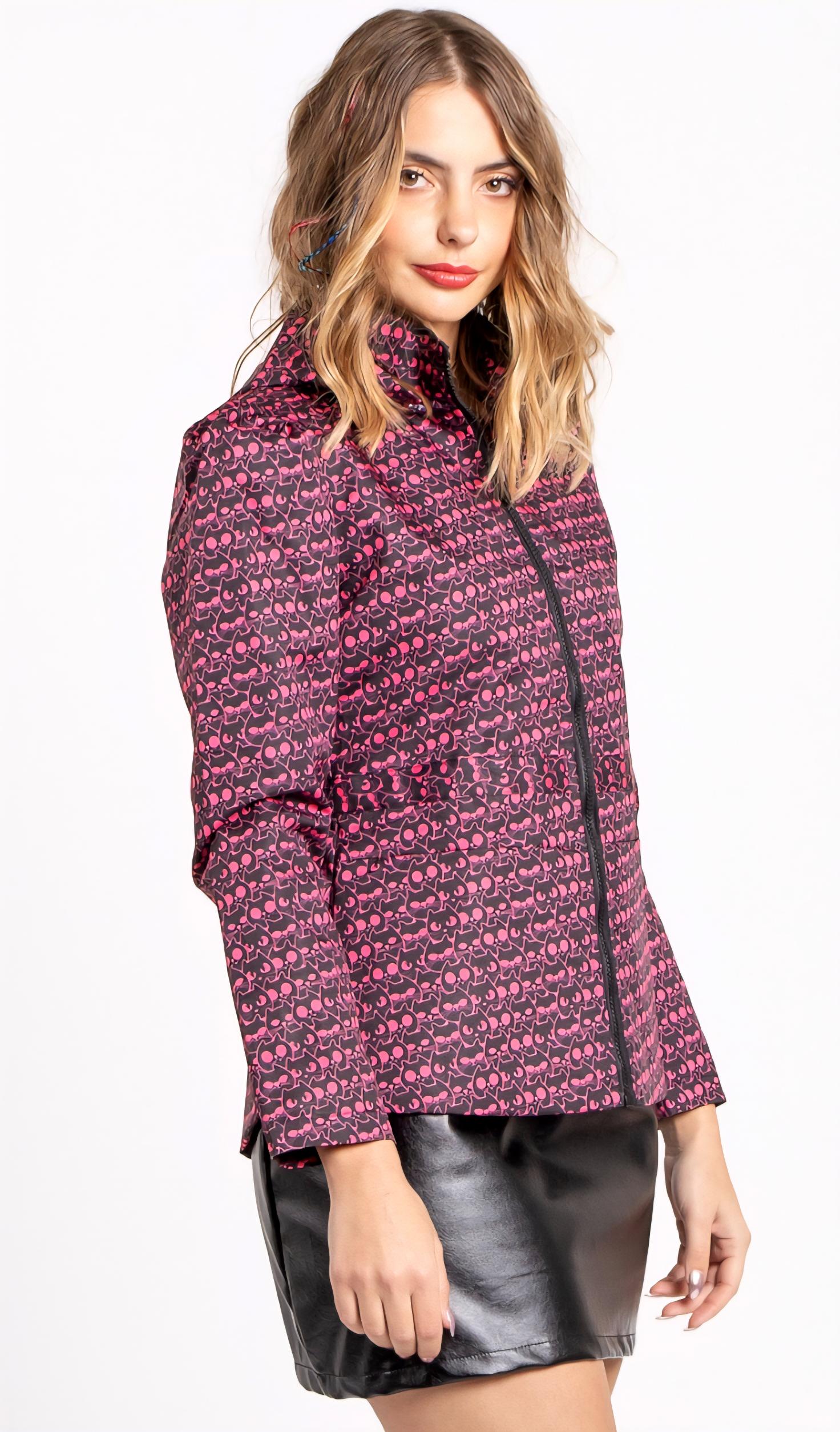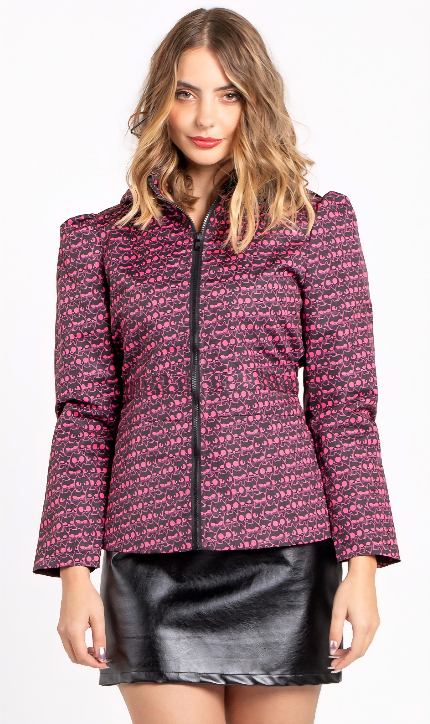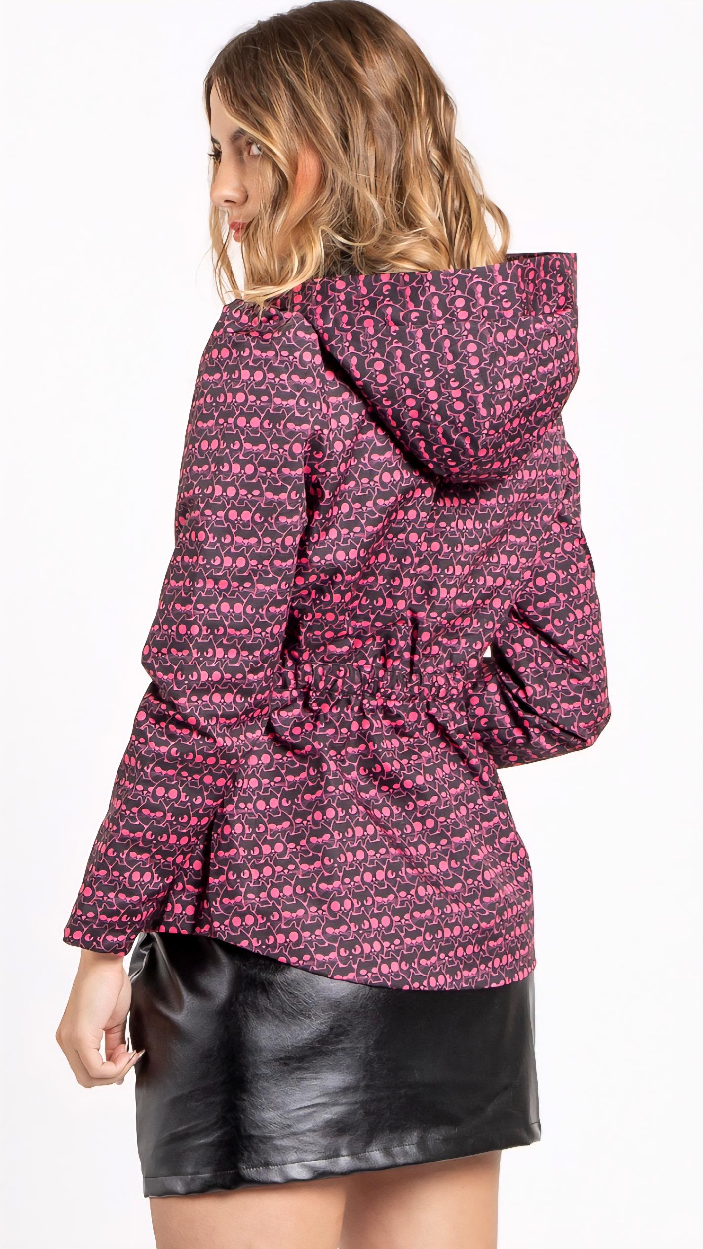 Estampación caras de gatitos en color rojo sobre fondo negro.