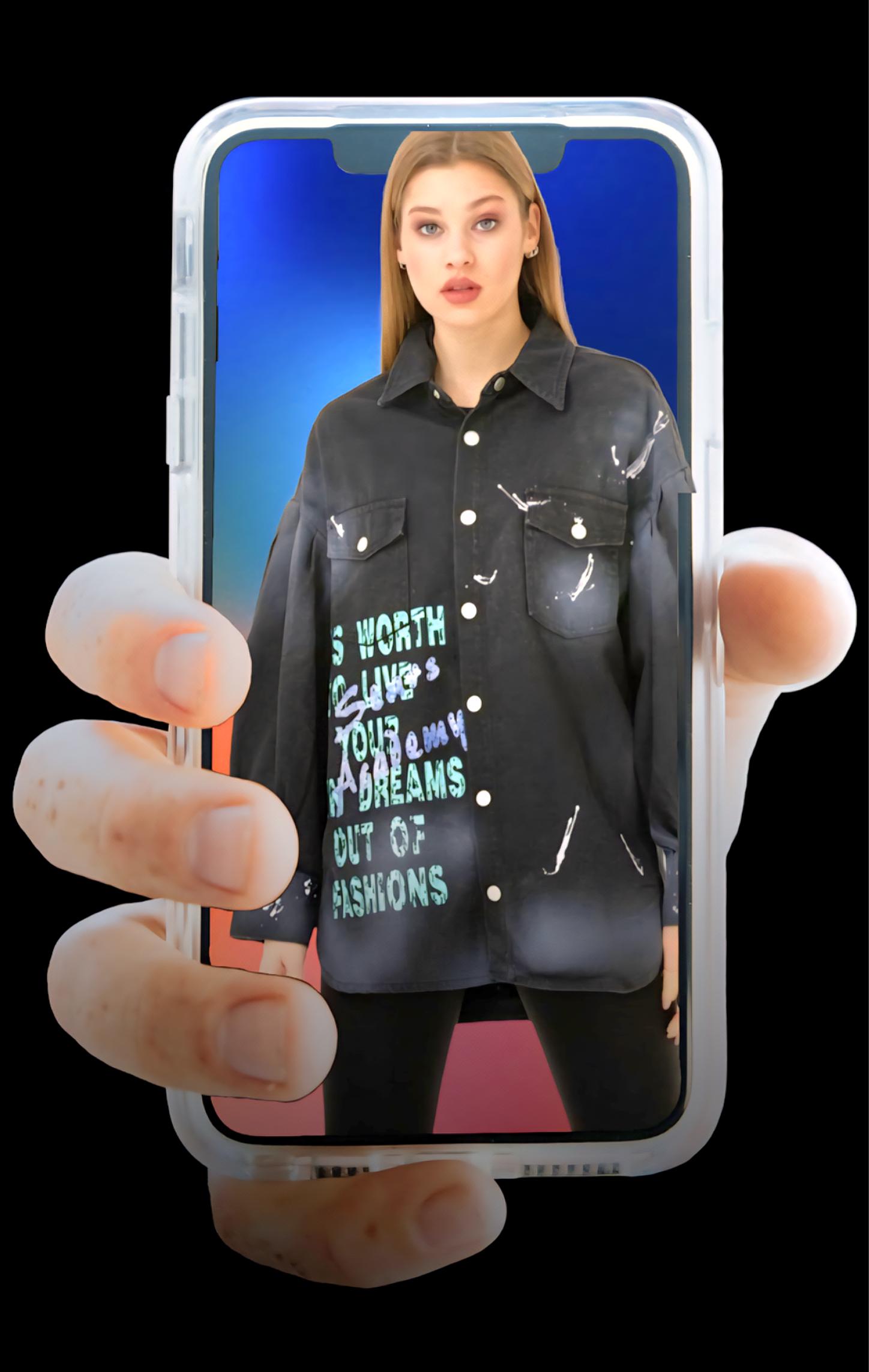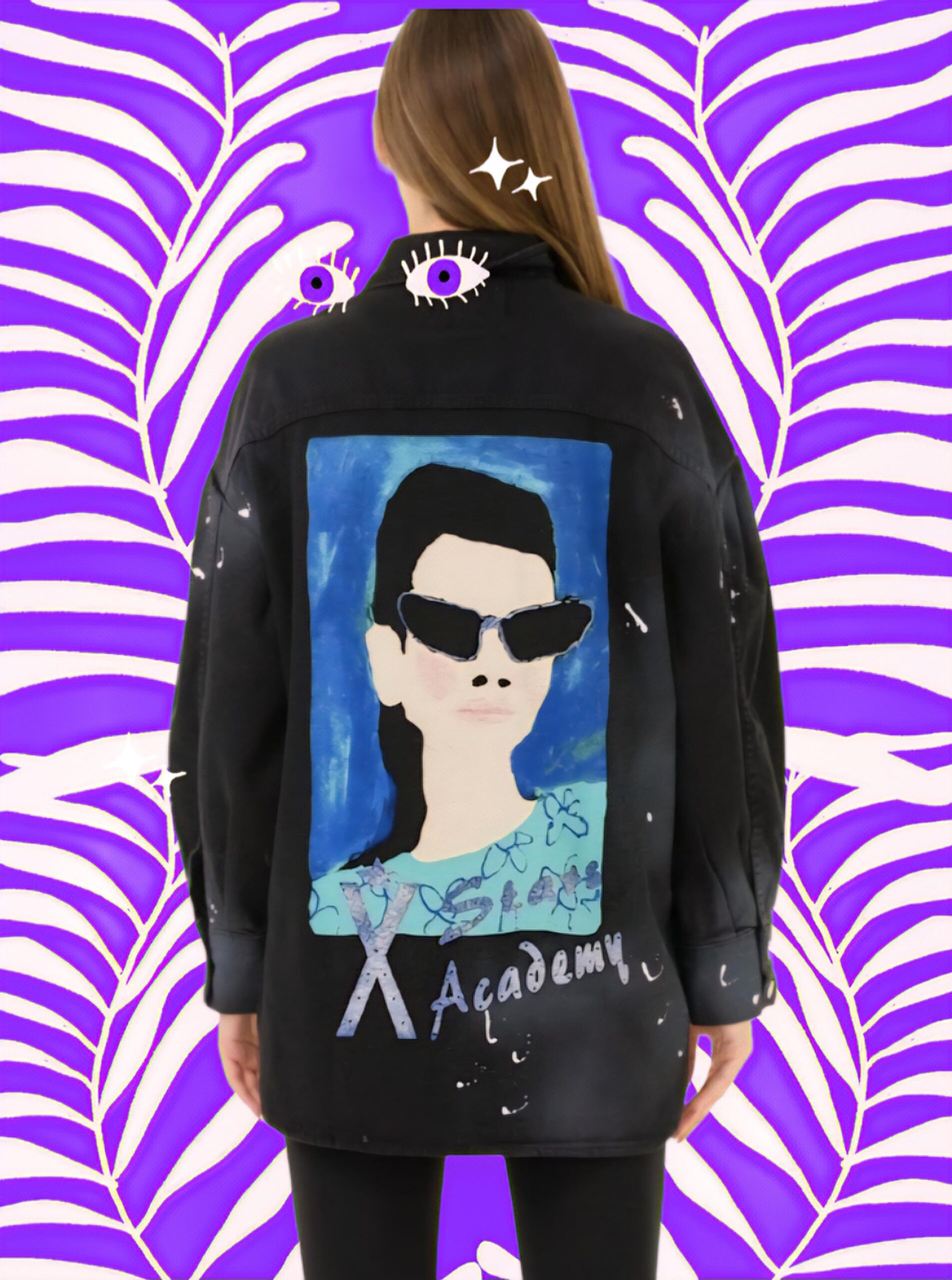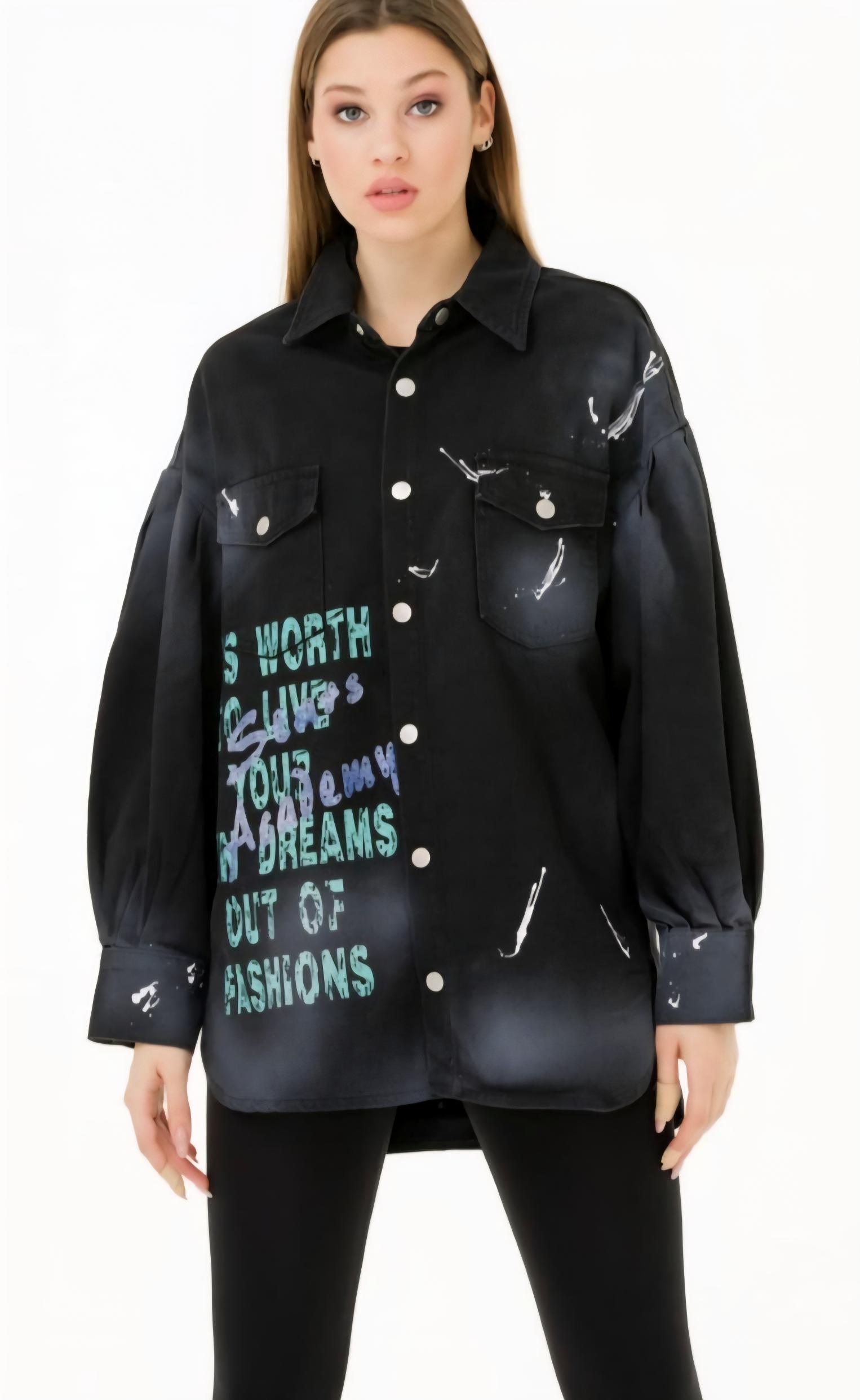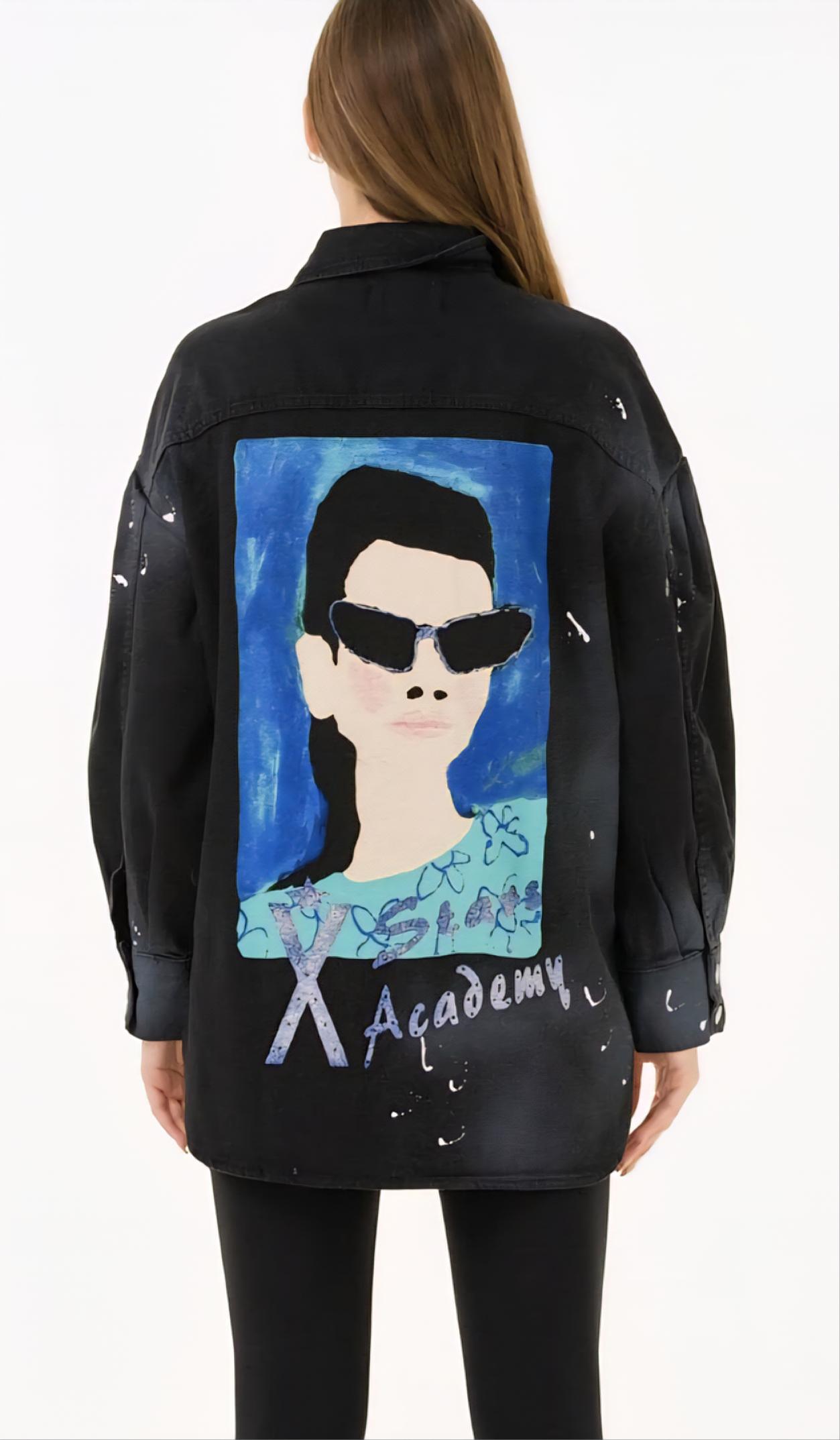 Vaquero lavado en degradé con manchas en blanco y letras delanteras en tonalidades azules.