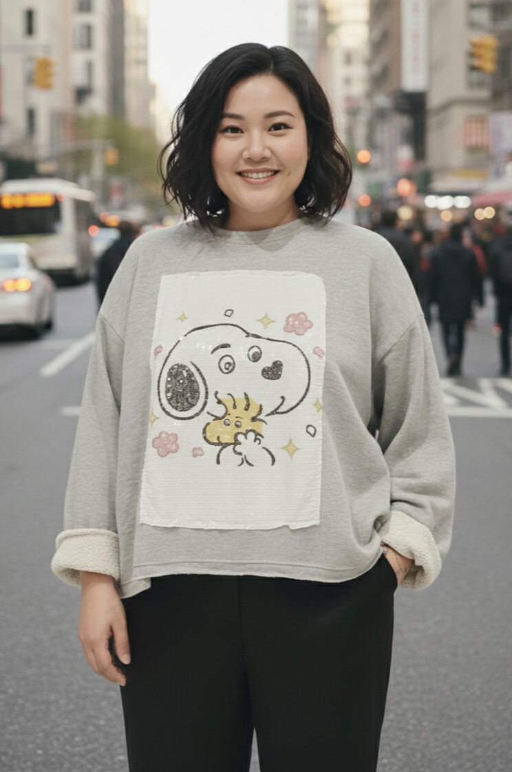 Detalle de parche delantero estampado en lentejuelas.