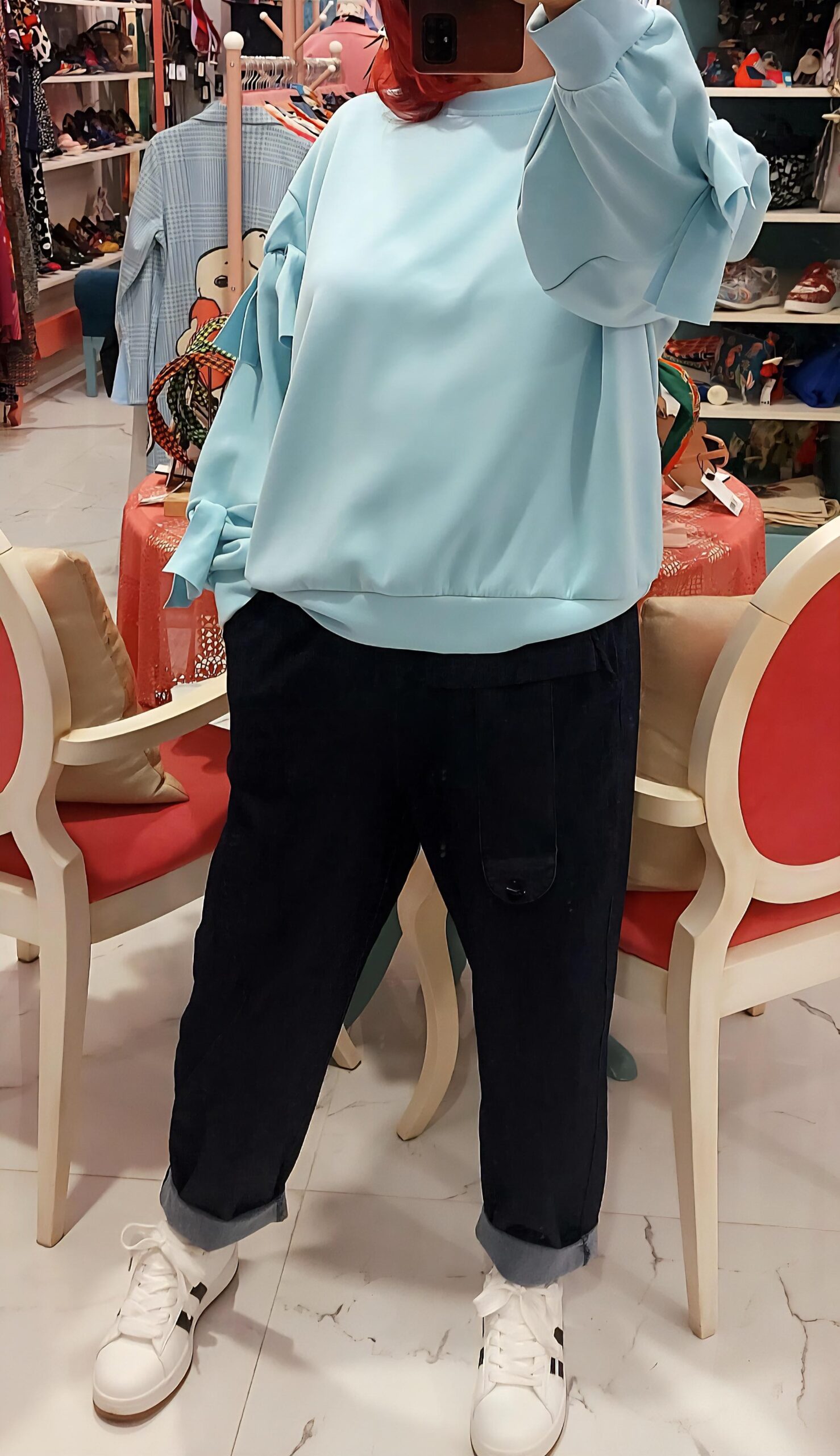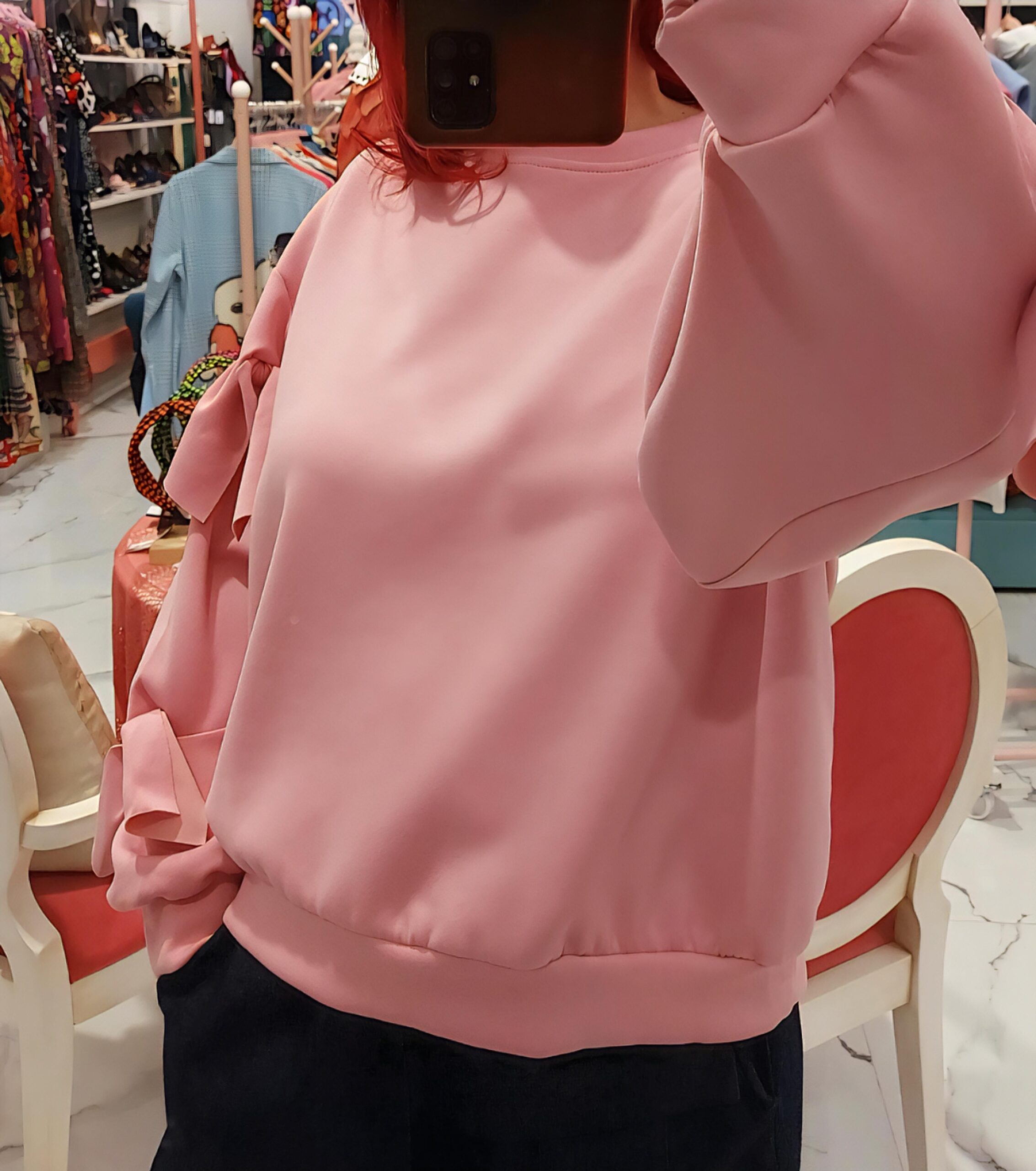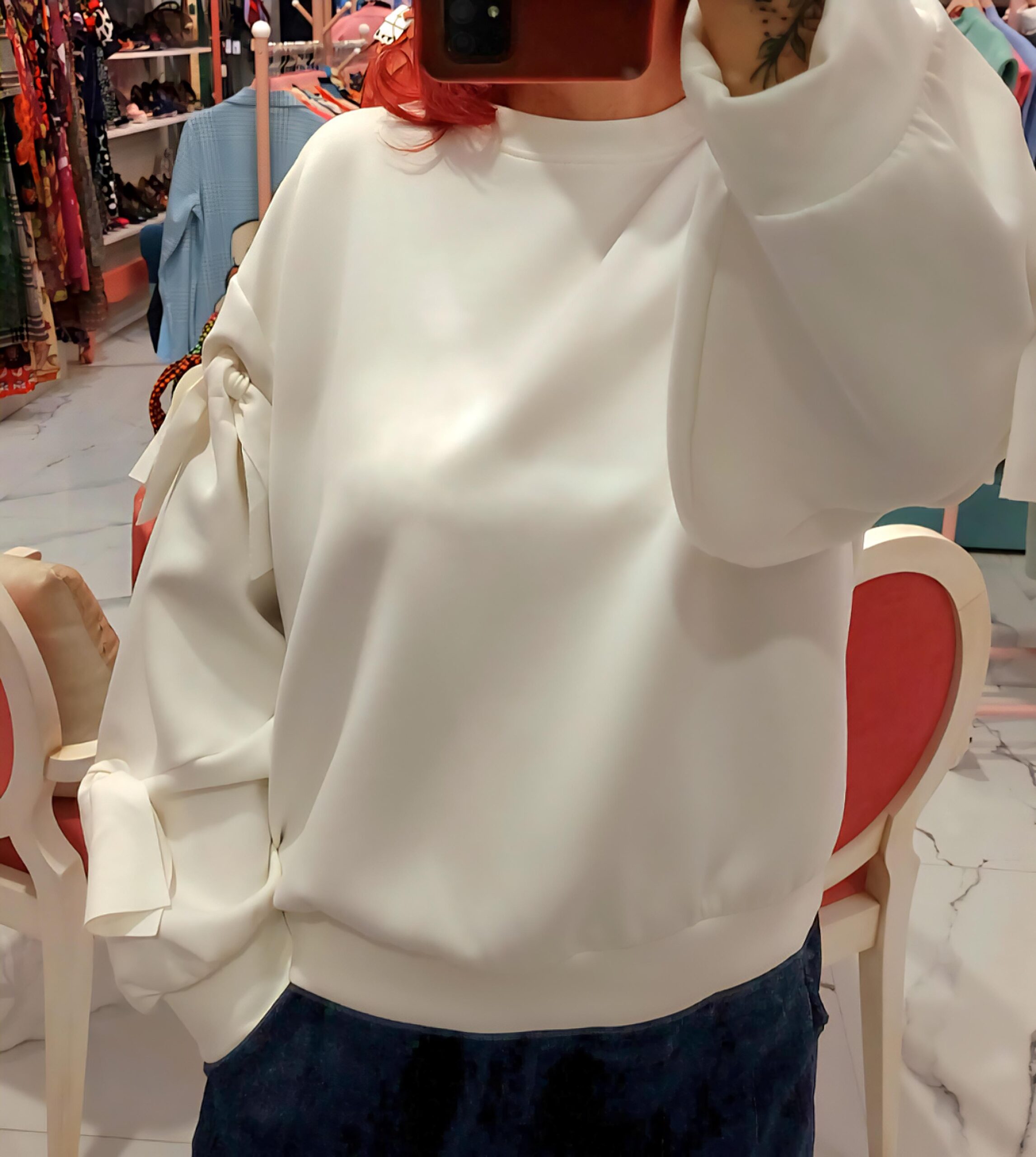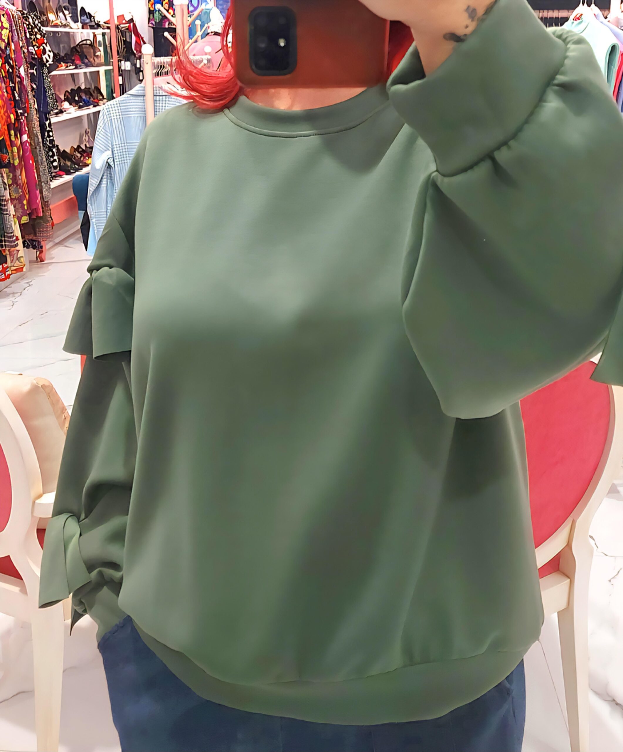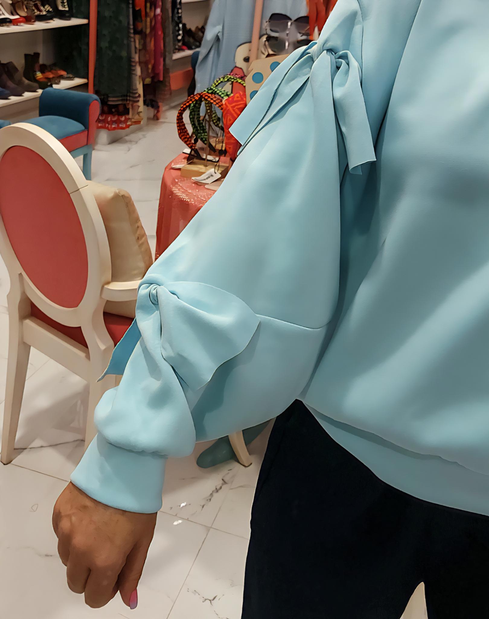 Cuello redondo y manga larga de globo con detalle de lazos decorativos.