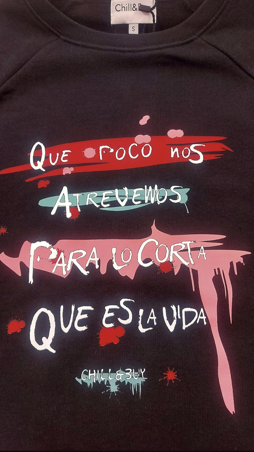 Estampación delantera con la frase «QUE POCO NOS ATREVEMOS PARA LO CORTA QUE ES LA VIDA»