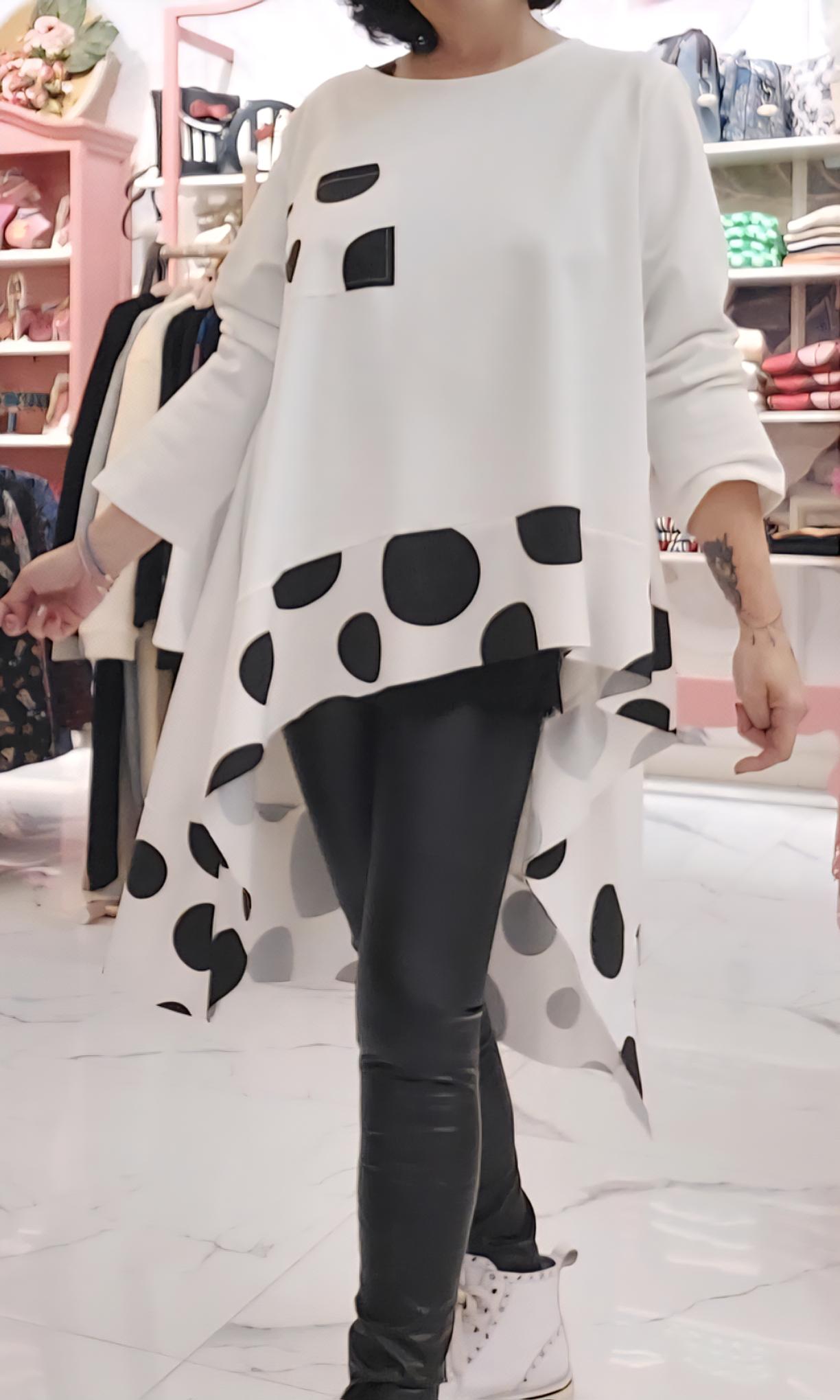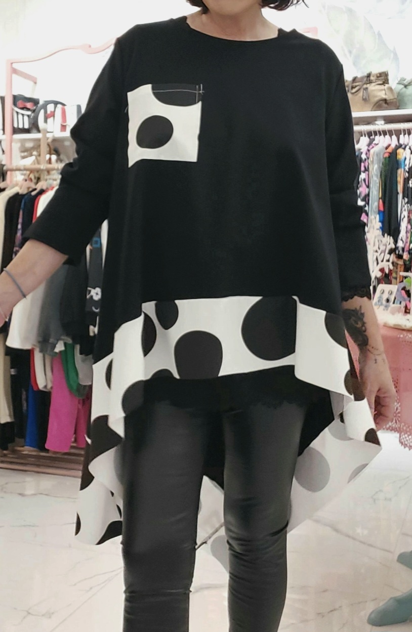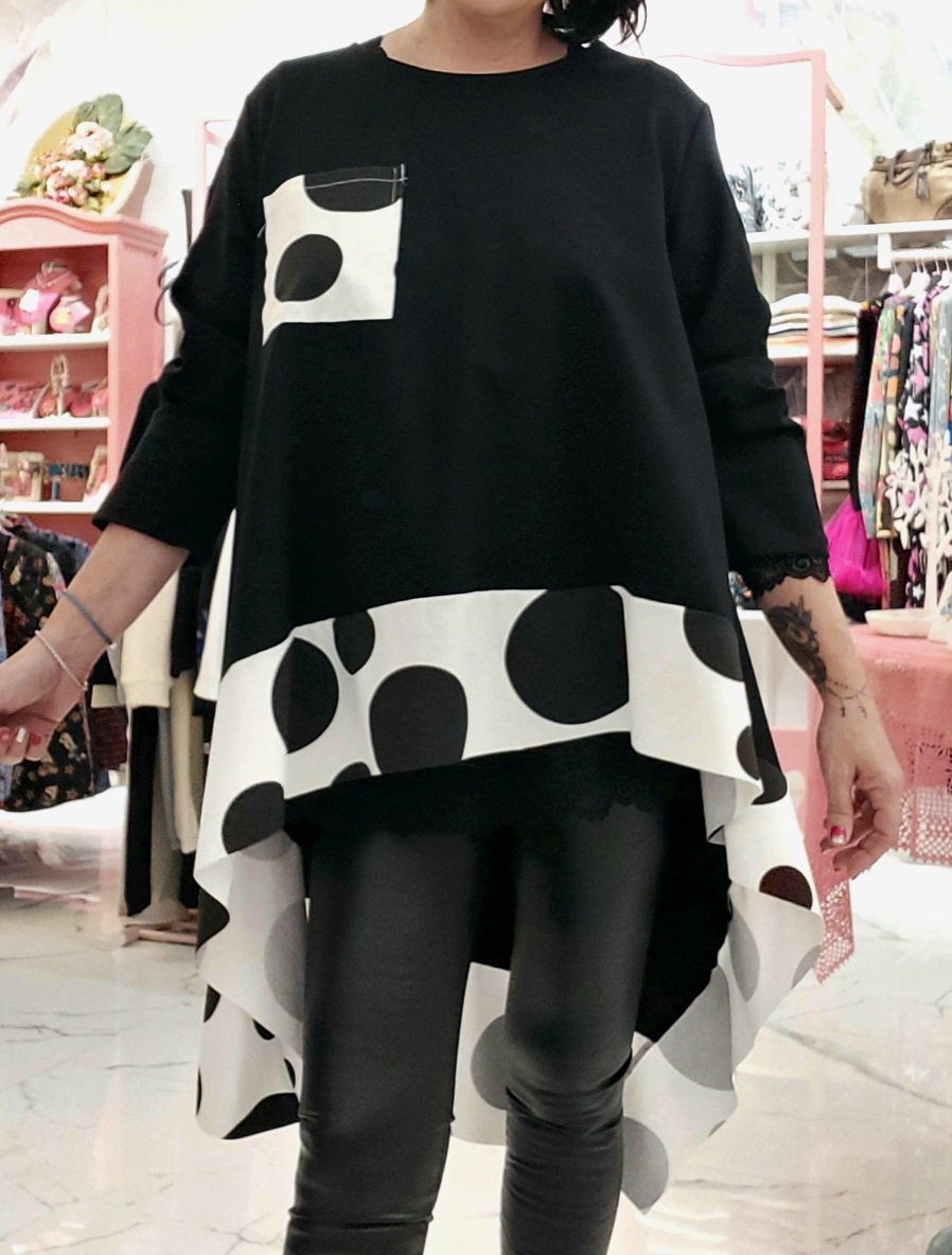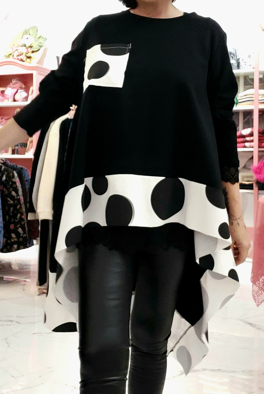 Detalle de cenefa en el bajo y bolsillo delantero de maxi lunares a contraste.