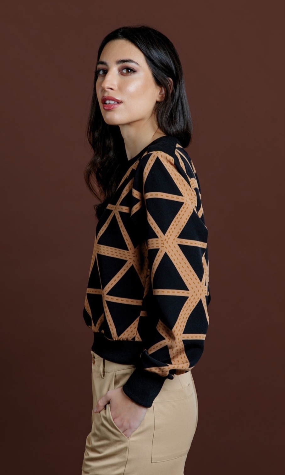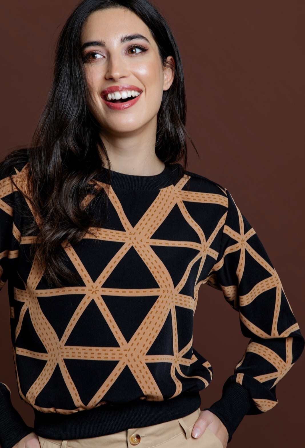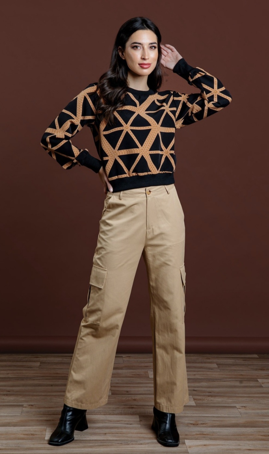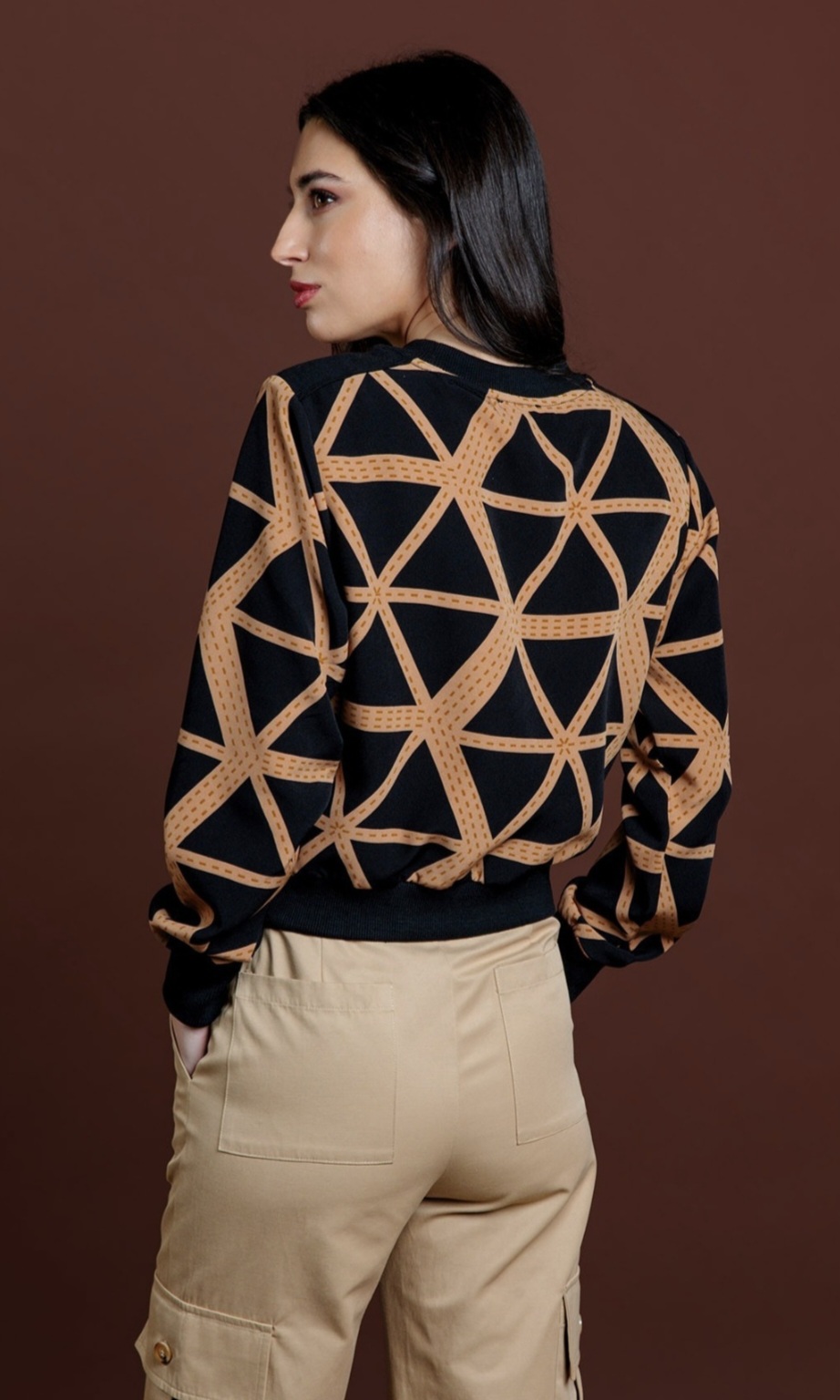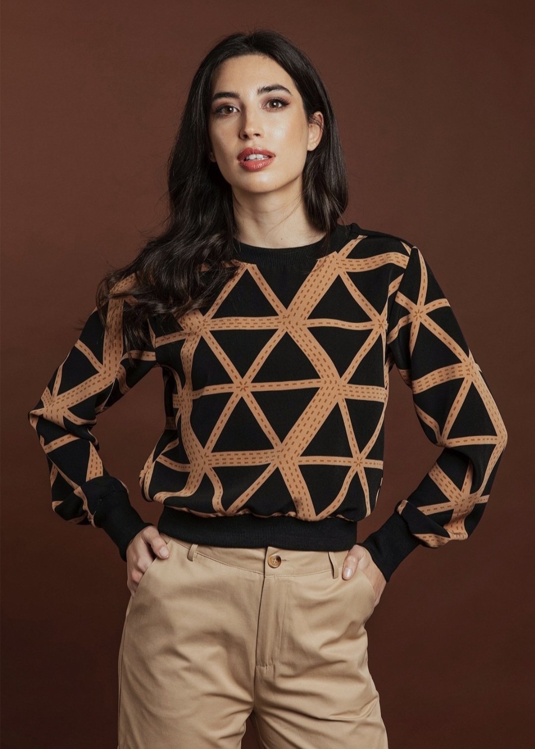 Blusa estampada de triángulos en negro y camel.