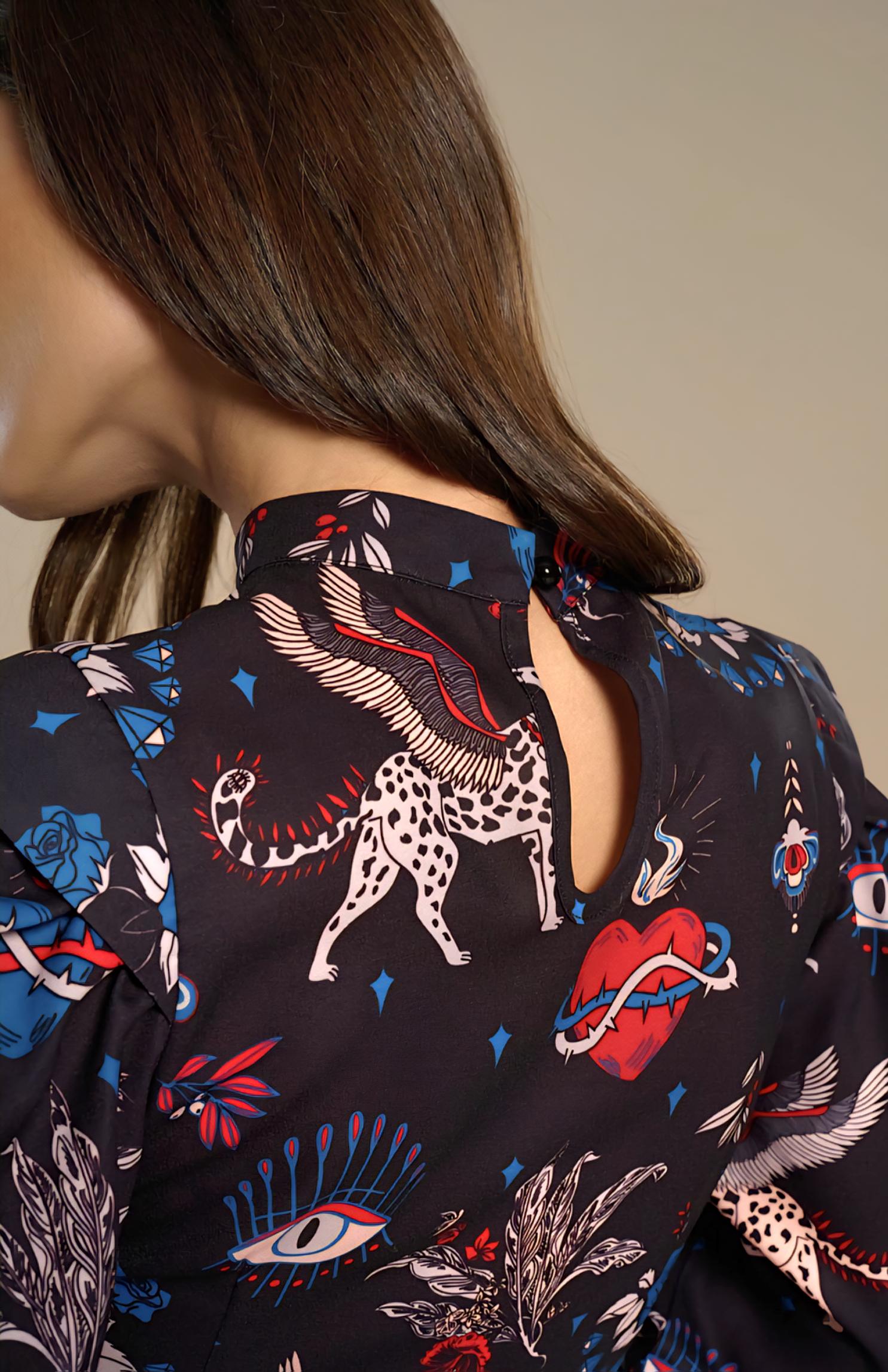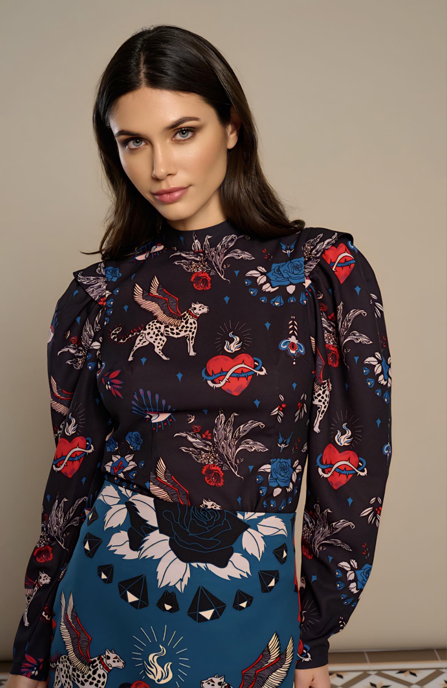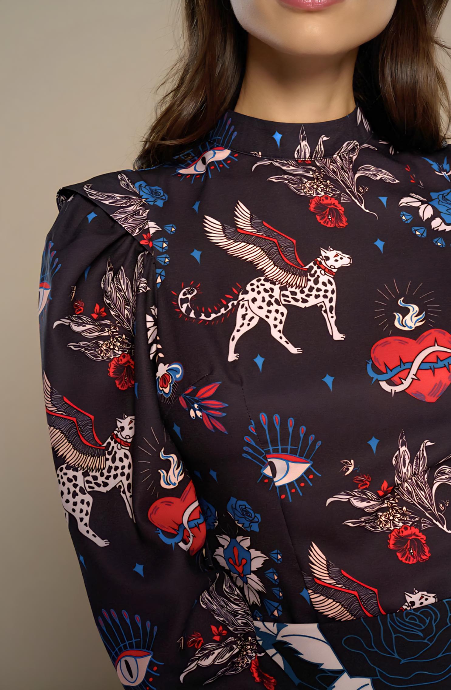 Estampado místico gatos alados y corazones multicolor sobre fondo azul.