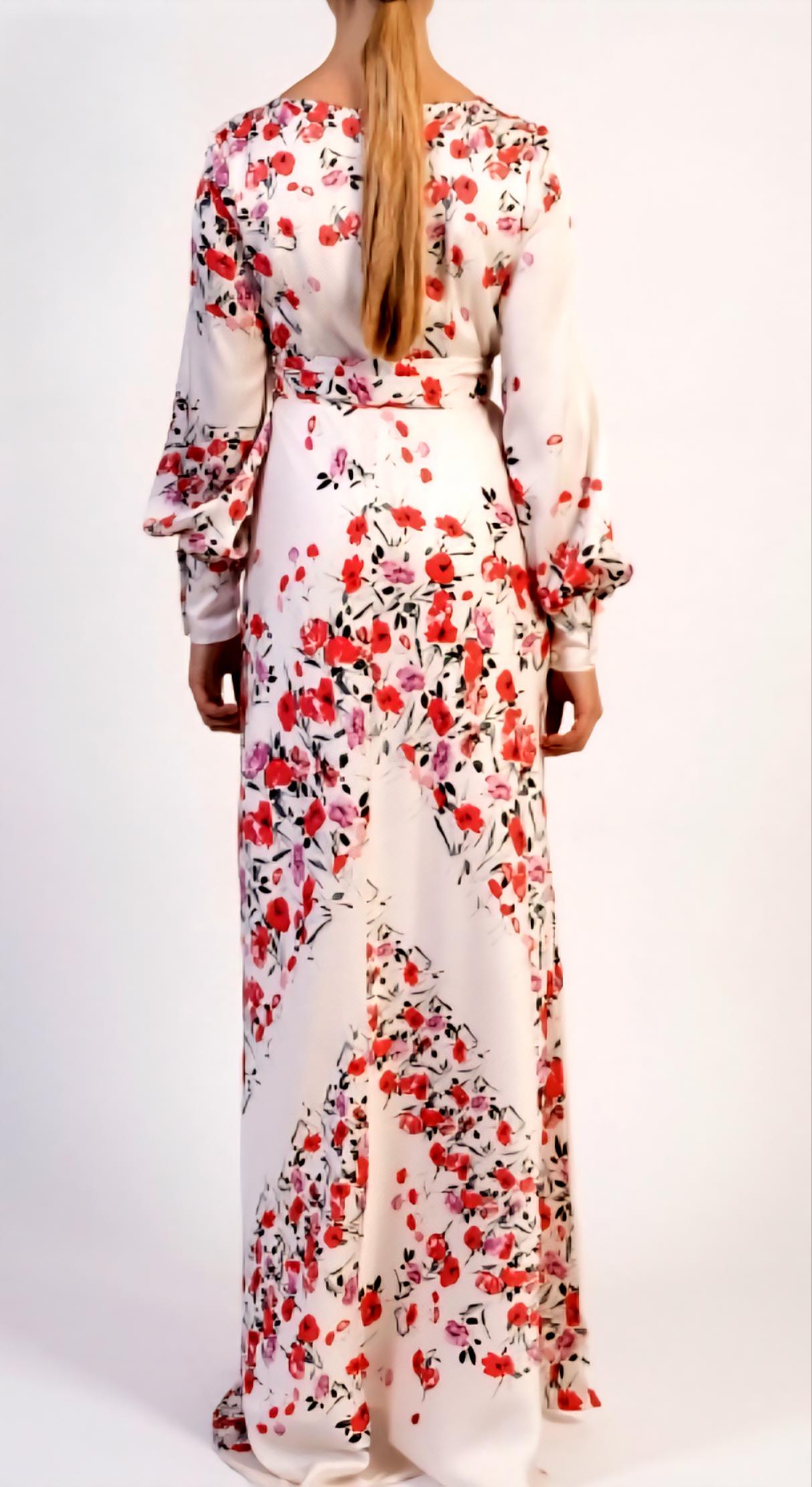 Vestido largo en tejido fluido satinado, corte bajo pecho y falda con vuelo.