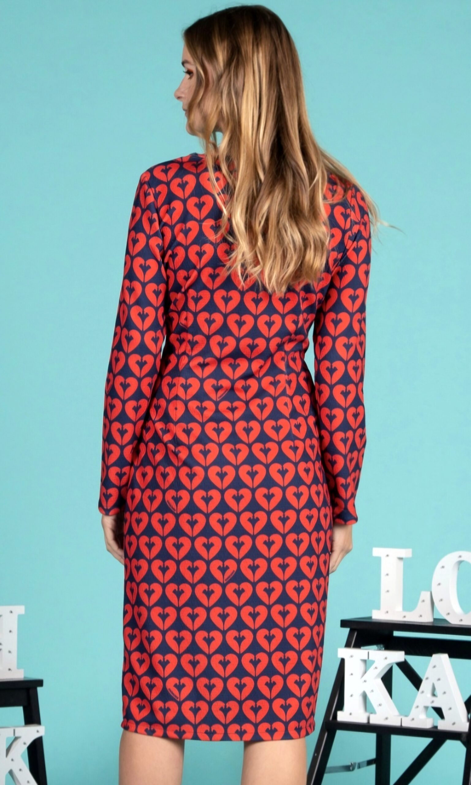 Estampación de corazones rojos sobre fondo azul marino.