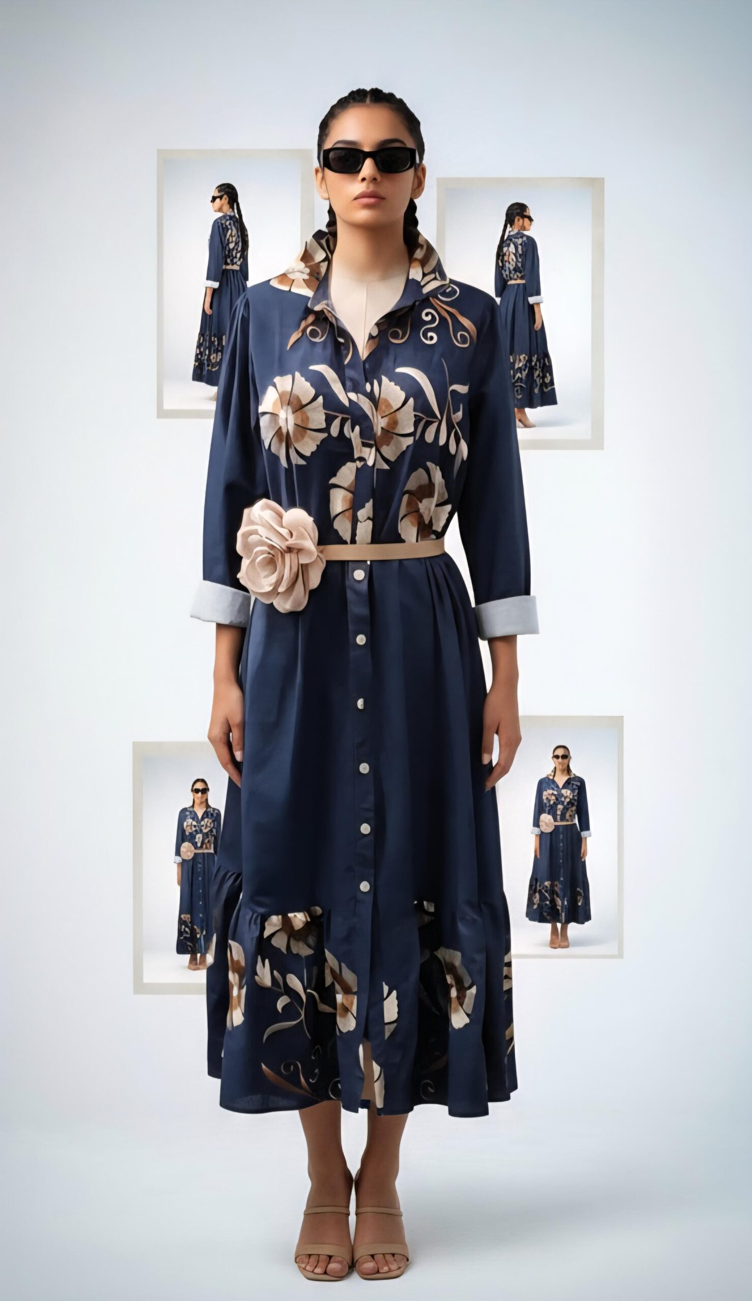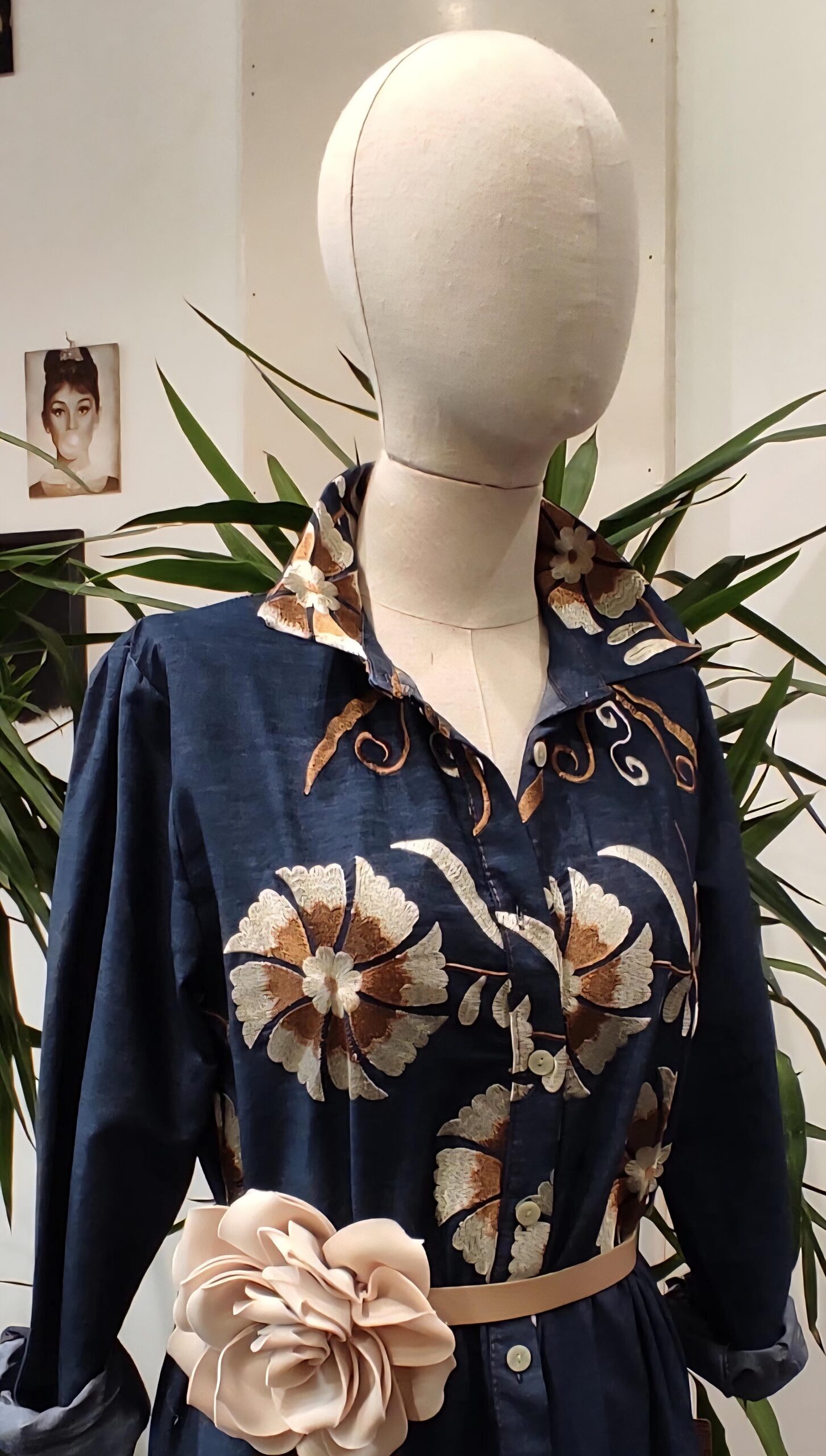 Bordados en tonos verdes y beige en cuerpo, puños y volante.