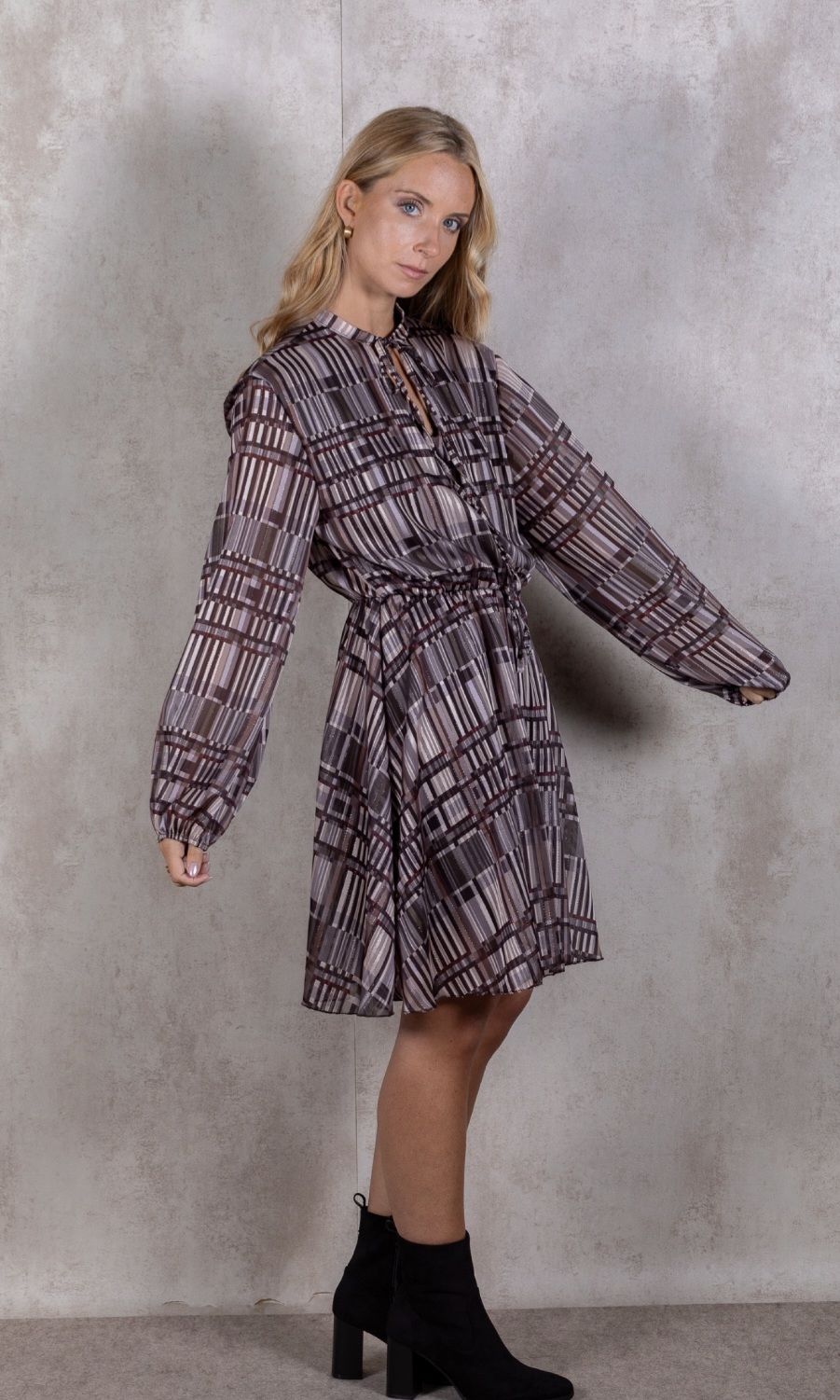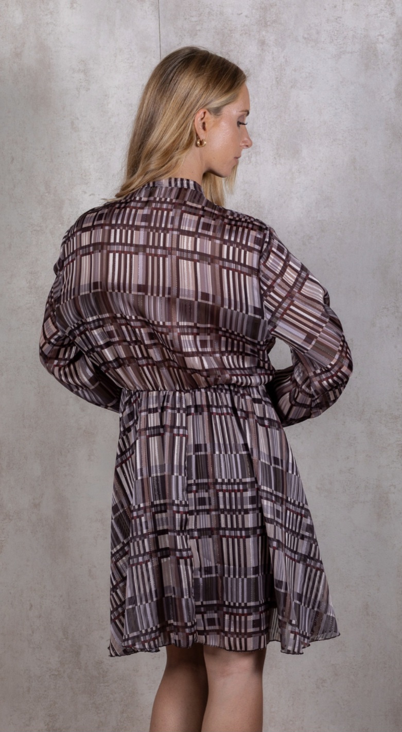 Vestido corto en tejido de gasa a cuadros en tonos marrones.