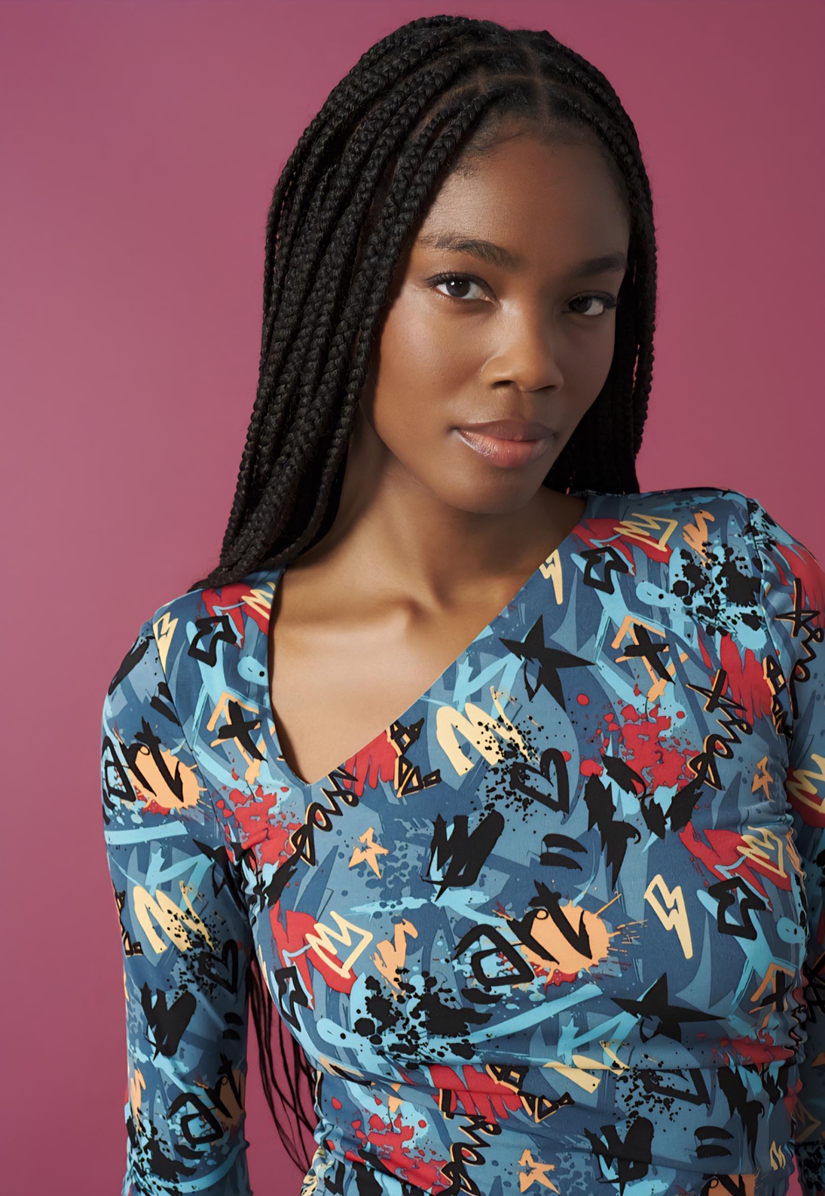Vestido midi de punto elástico, cuello triangular lateralizado y manga larga.