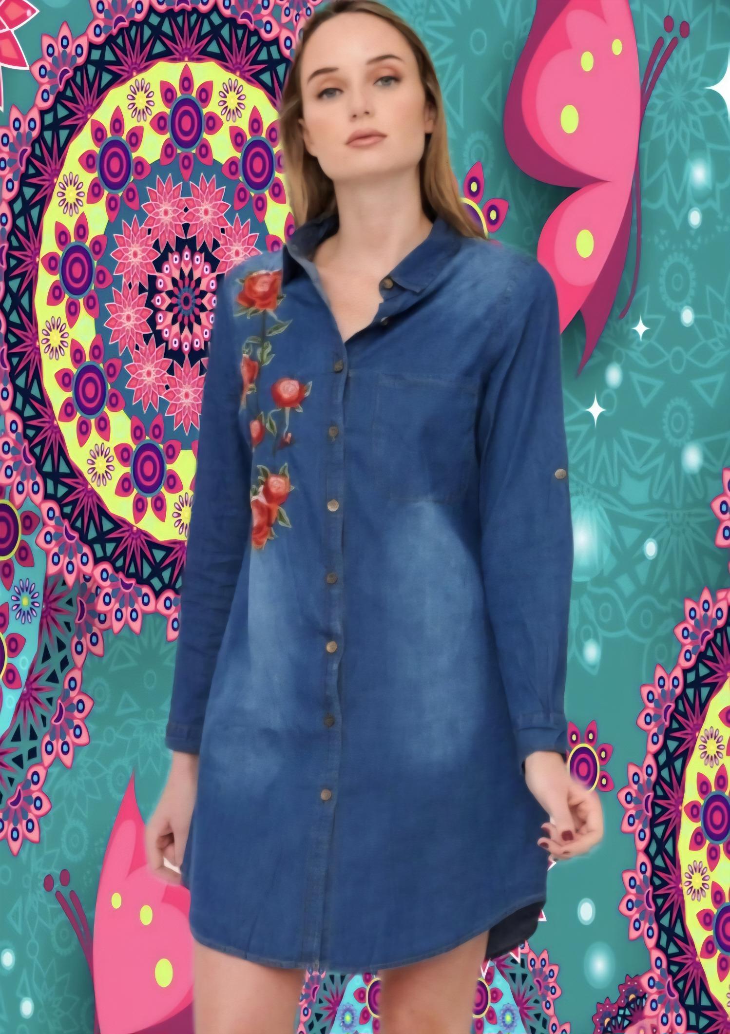 Tejido vaquero suave con detalle floral bordado en delantero derecho.