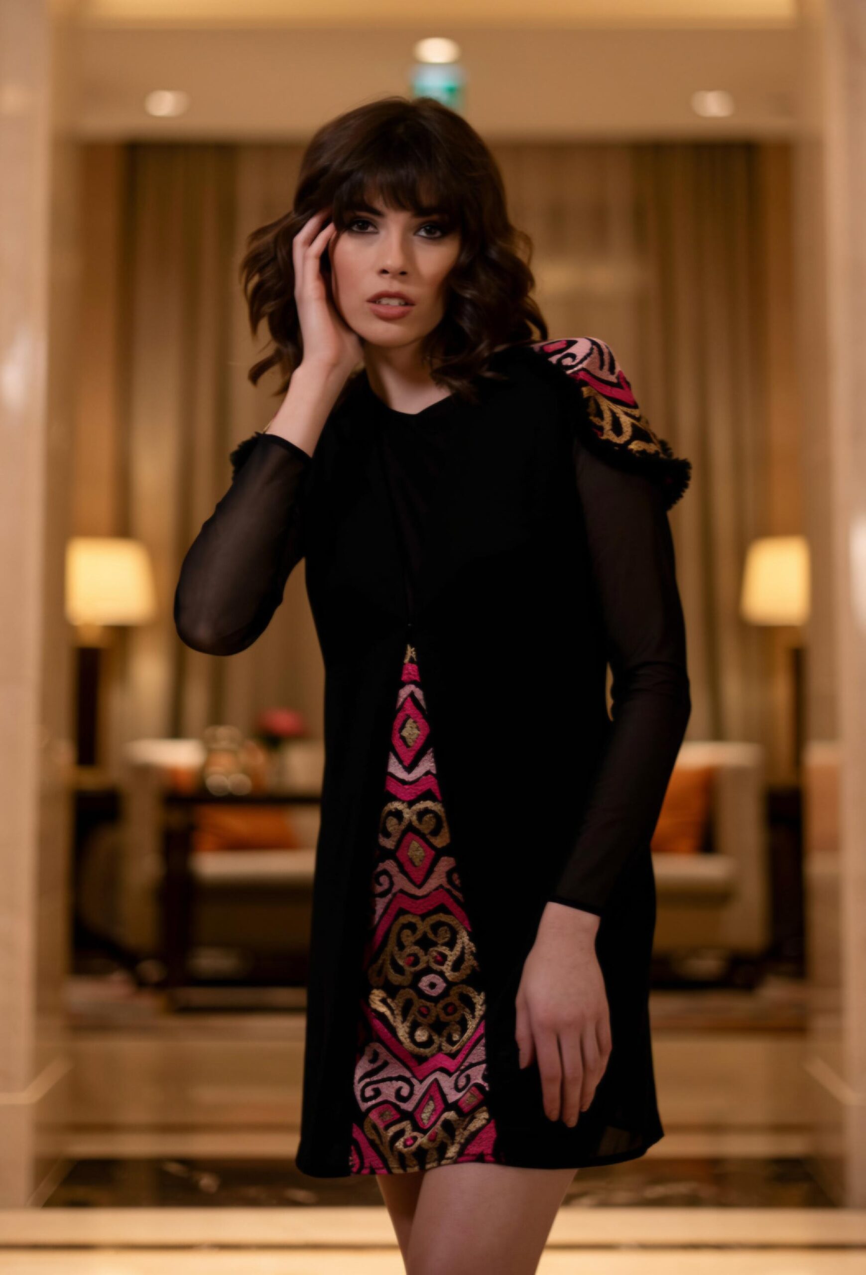 Vestido corto de Coctel en color negro con bordados.