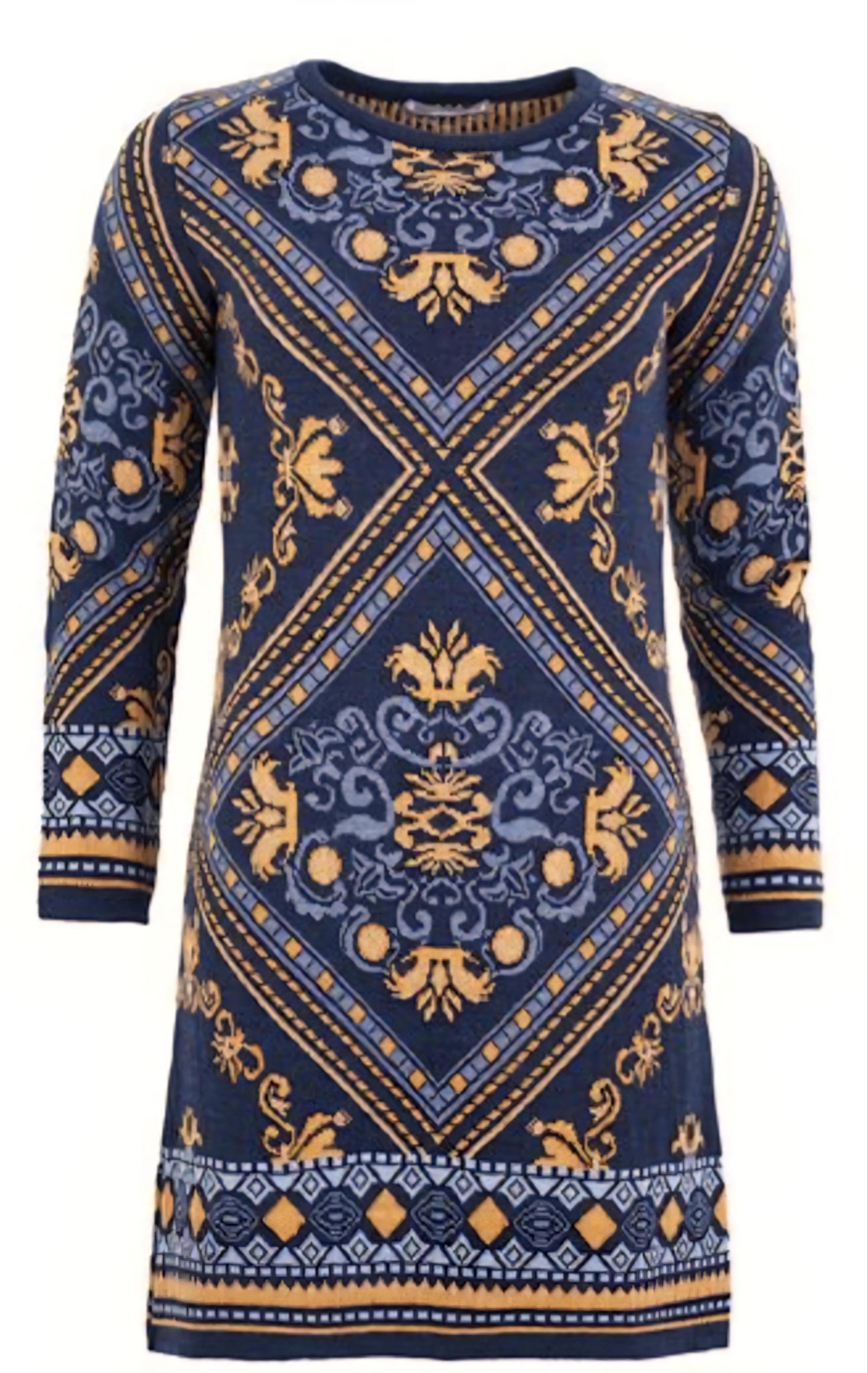 Estampación geométrica y floral en colores mostaza y celeste sobre fondo azul.