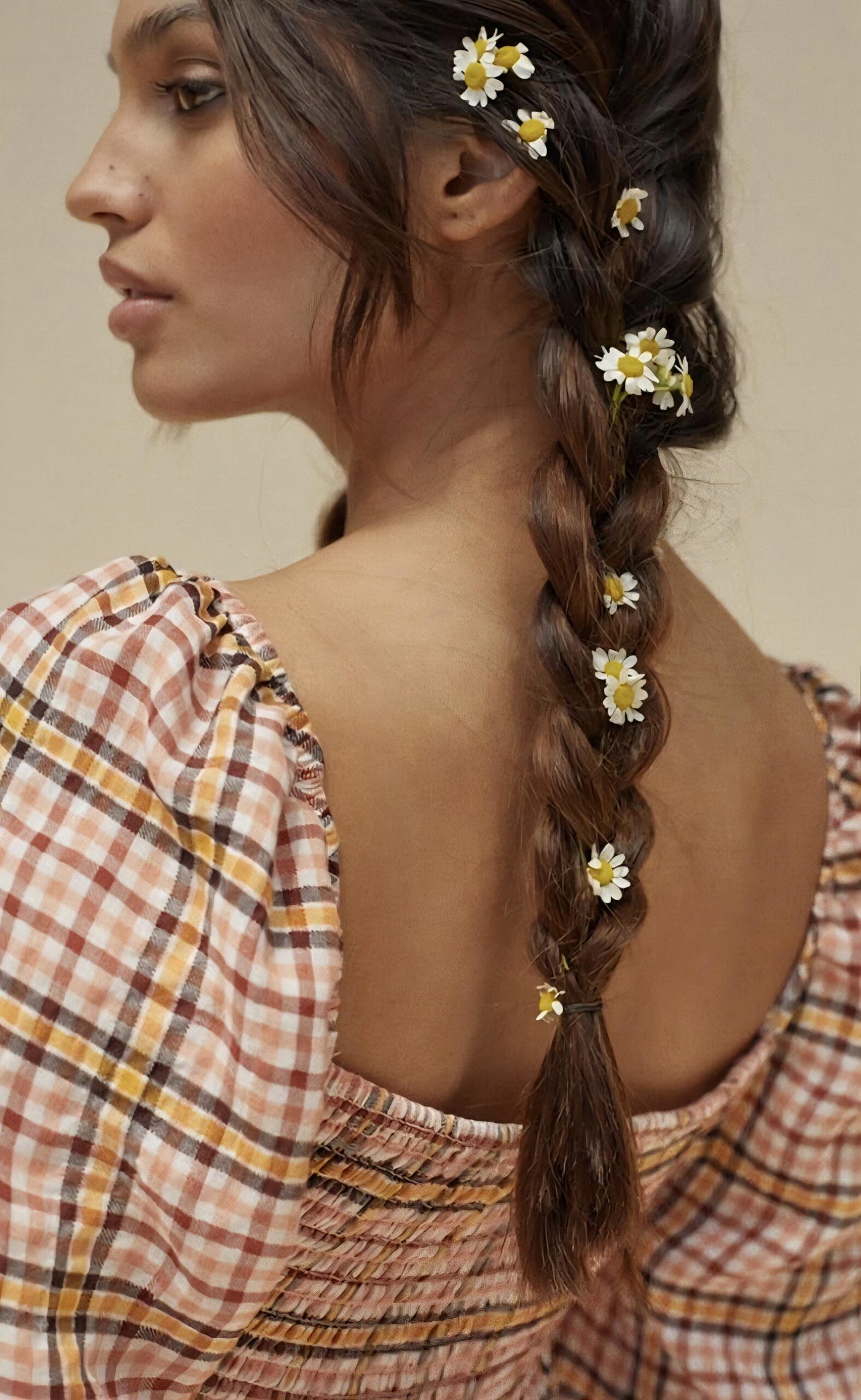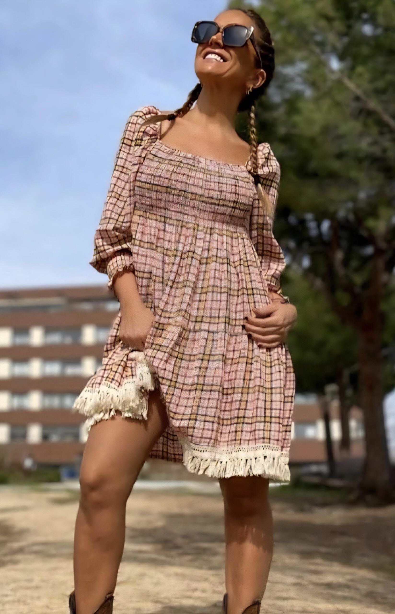 Vestido mini con estampado a cuadros en tonos rosas, tejas, marrones y beige.