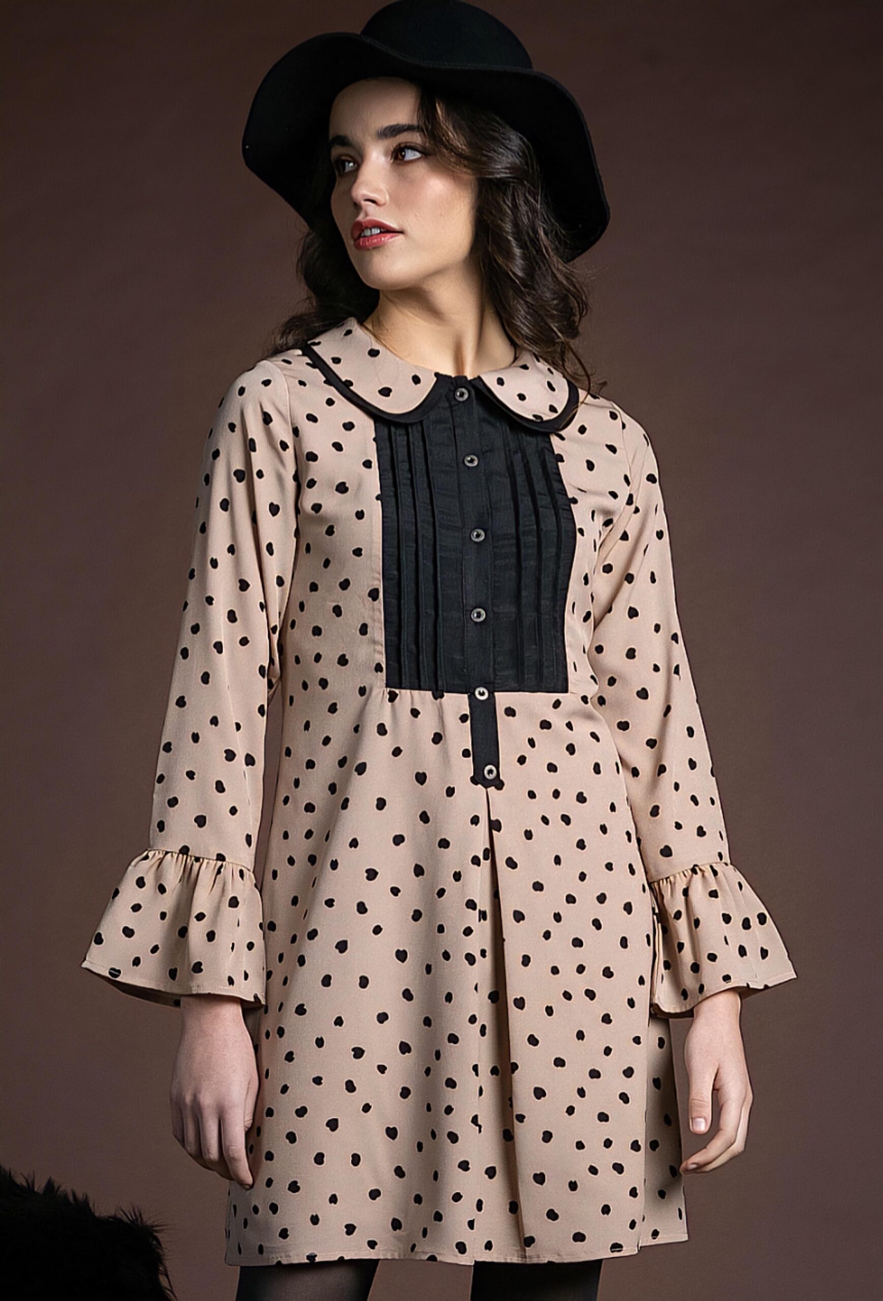 Vestido corto, cuello bebe y manga larga con volante de campana.