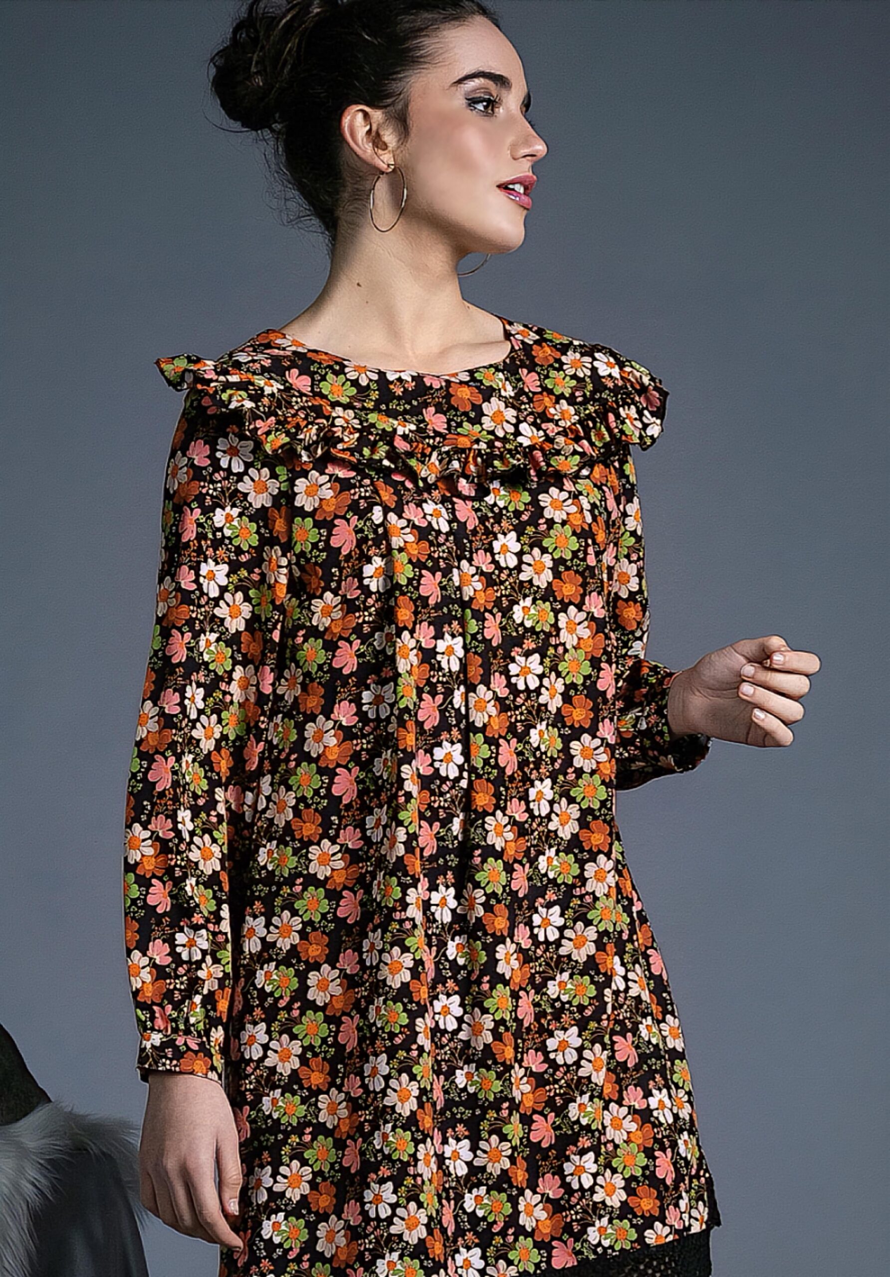 Vestido corto suelto con estampación floral multicolor sobre fondo negro.